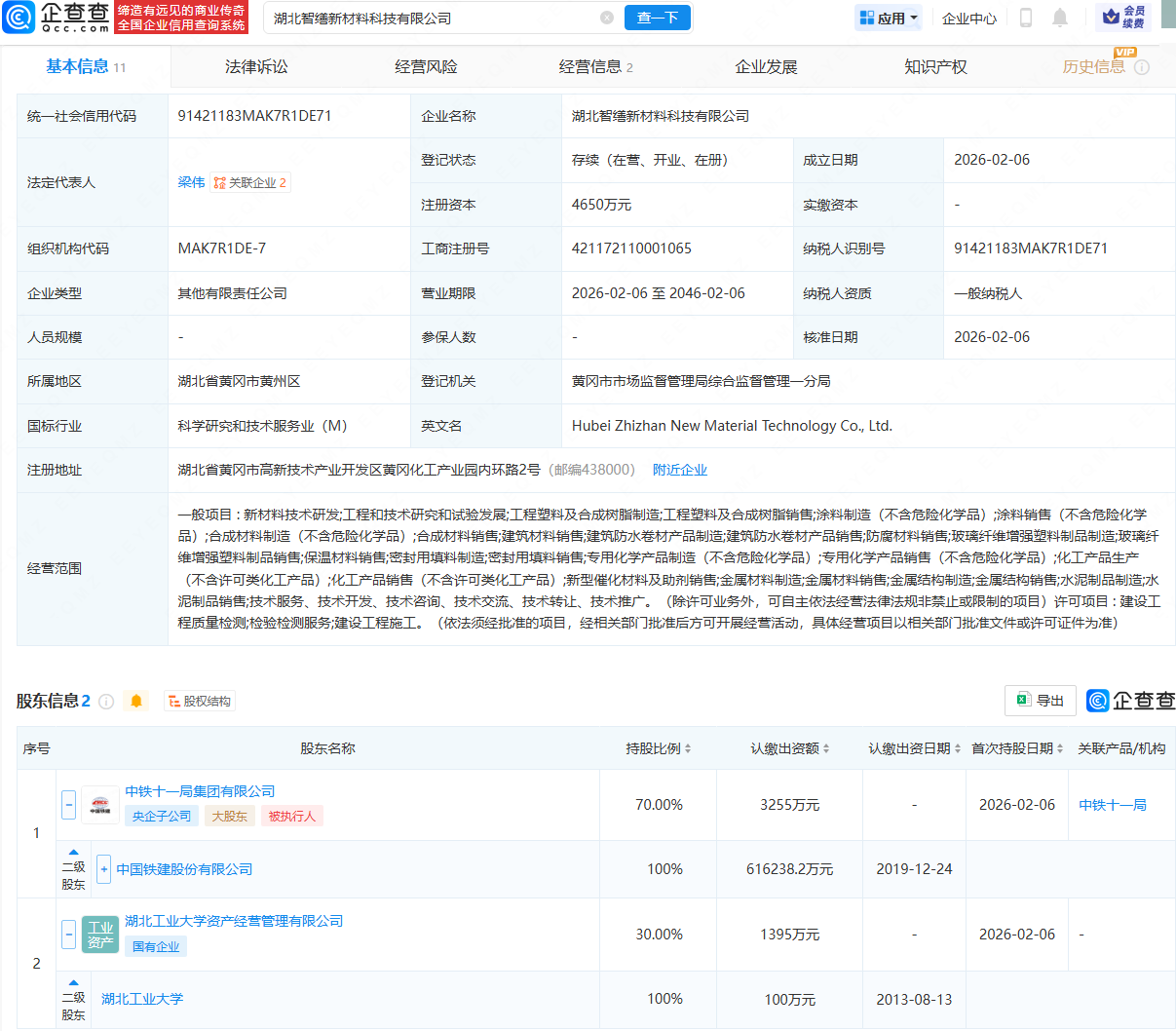 企查查APP显示,近日,湖北智缮新材料科技有限公司成立,法定代表人为梁伟,注册资本为4650万元,经营范围包含:新材料技术研发;合成材料销售;建筑材料销售;玻璃纤维增强塑料制品制造;密封用填料制造等。企查查股权穿透显示,该公司由中国铁建(601186)全资子公司中铁十一局集团有限公司、湖北工业大学旗下湖北工业大学资产经营管理有限公司共同持股。