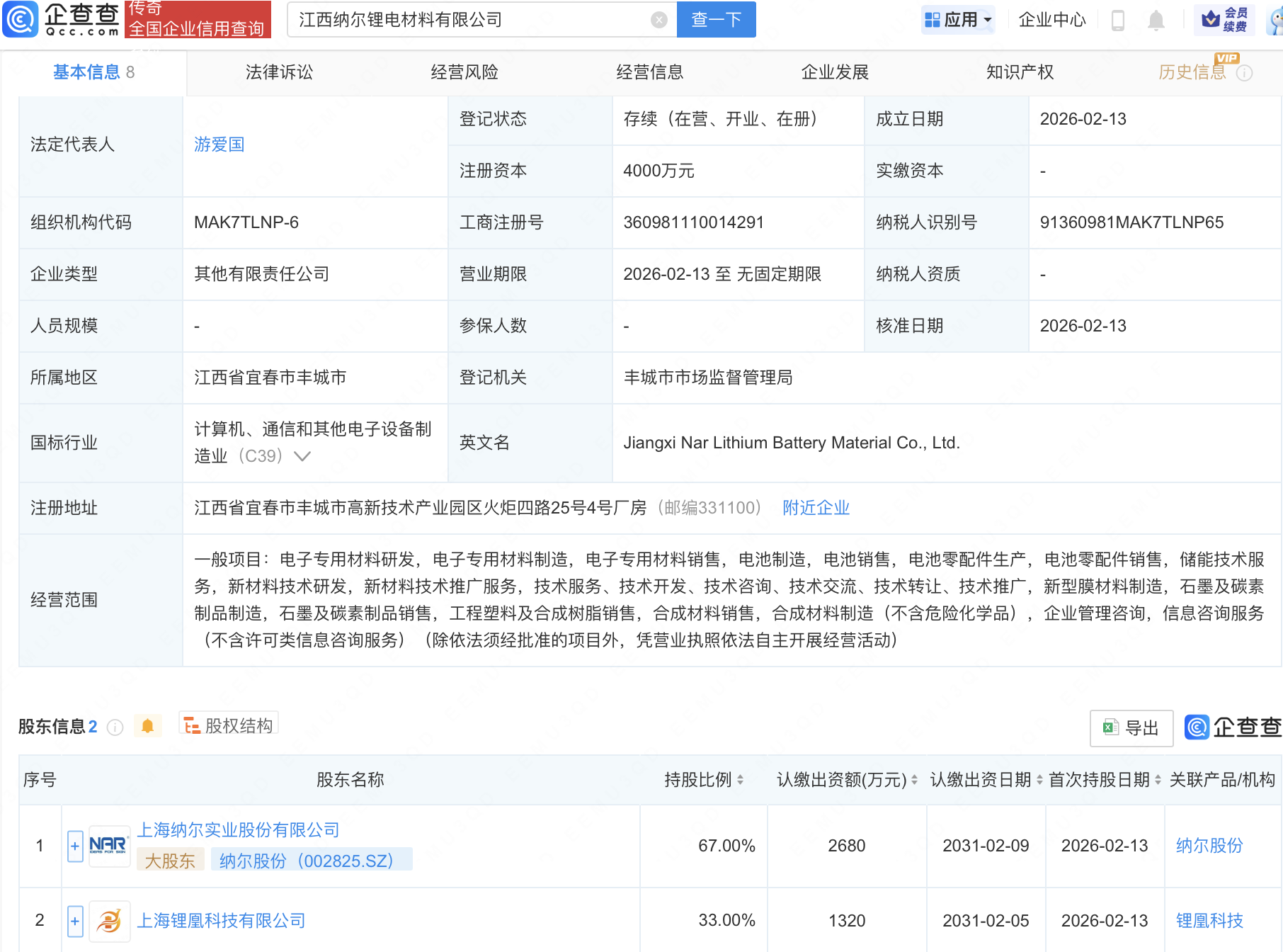 企查查APP显示,近日,江西纳尔锂电材料有限公司成立,经营范围包含:电池零配件生产,电池零配件销售,储能技术服务,新材料技术研发,新材料技术推广服务等。企查查股权穿透显示,该公司由纳尔股份(002825)等共同持股。