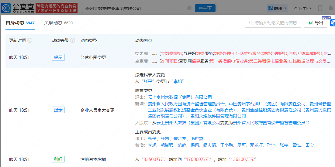 企查查APP显示,近日,贵州大数据产业集团有限公司发生工商变更,注册资本增加到17亿元;原股东云上贵州大数据(集团)有限公司退出,由贵州省人民政府国有资产监督管理委员会、中国贵州茅台酒厂(集团)有限责任公司、贵州省新型工业化发展股权投资基金合伙企业(有限合伙)等直接持股;公司的主要人员发生变更,同时,公司的经营范围新增“人工智能公共数据平台;卫星遥感数据处理;人工智能行业应用系统集成服务;人工智能应用软件开发;人工智能基础软件开发等。”