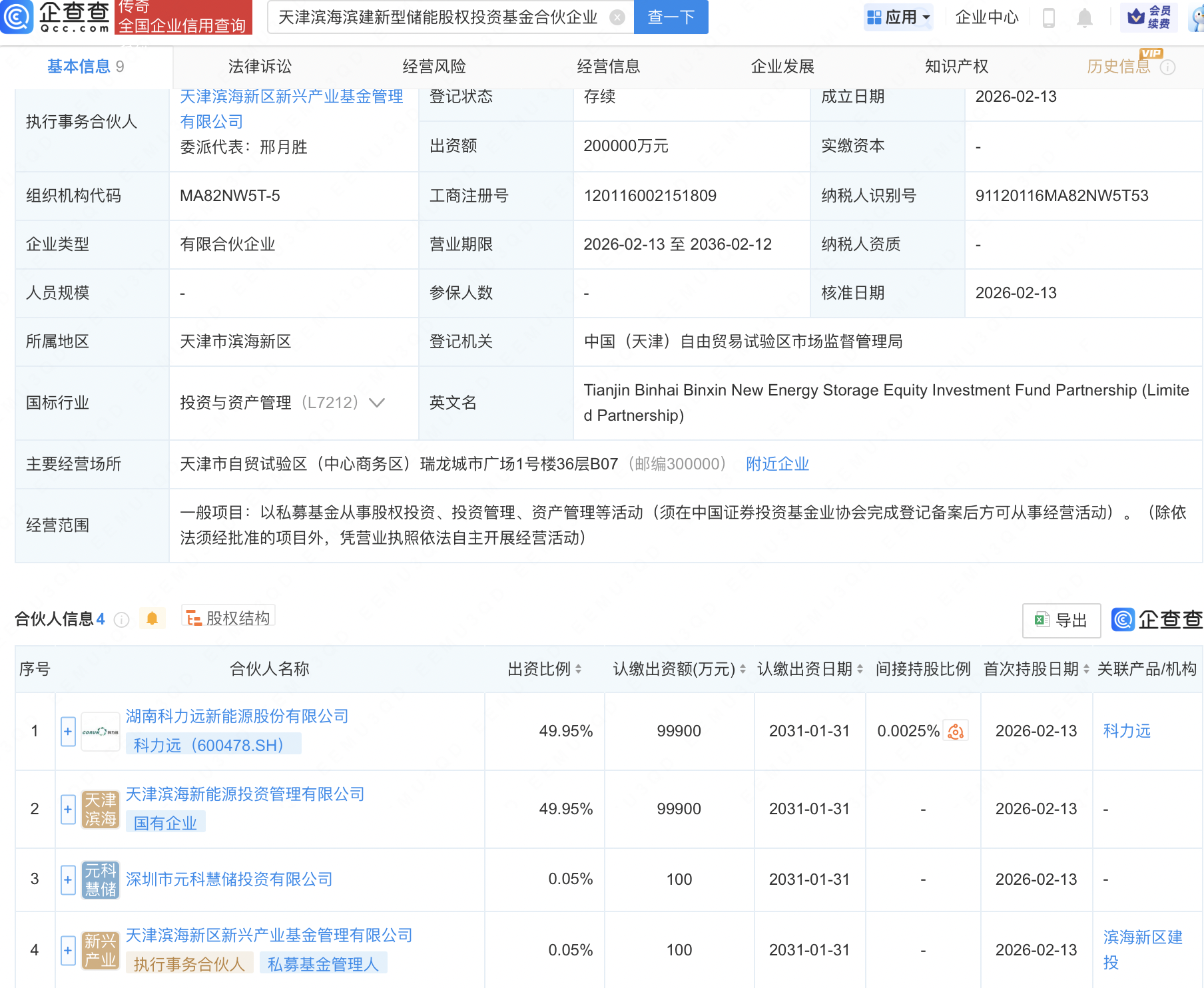 企查查APP显示,近日,天津滨海滨建新型储能股权投资基金合伙企业(有限合伙)成立,出资额20亿元,经营范围包含:以私募基金从事股权投资、投资管理、资产管理等活动。企查查股权穿透显示,该企业由科力远(600478)等共同出资。
