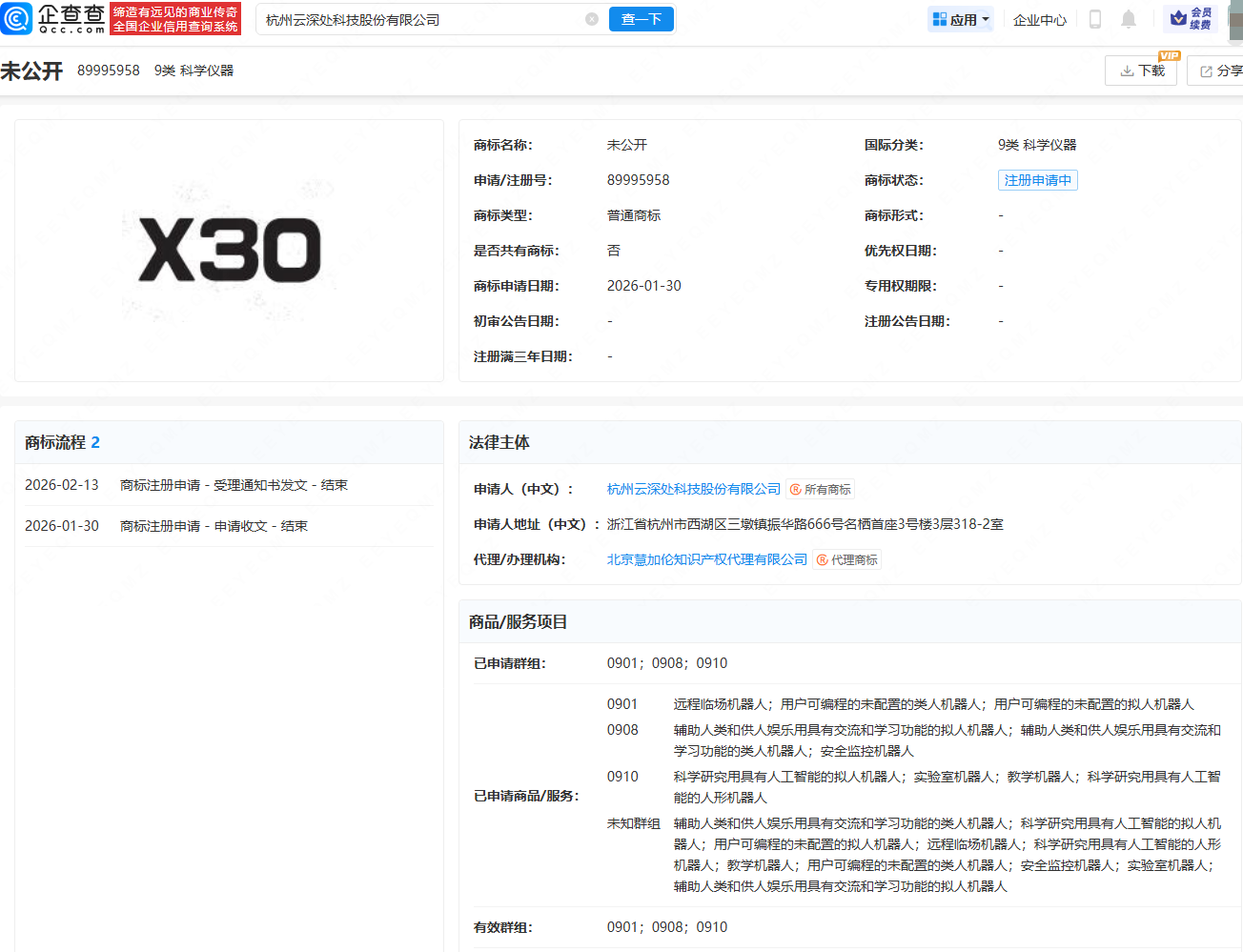 企查查APP显示,近日,杭州云深处科技股份有限公司申请注册“X30”商标,国际分类为9类 科学仪器,已申请商品/服务包括:远程临场机器人;用户可编程的未配置的类人机器人;用户可编程的未配置的拟人机器人等,