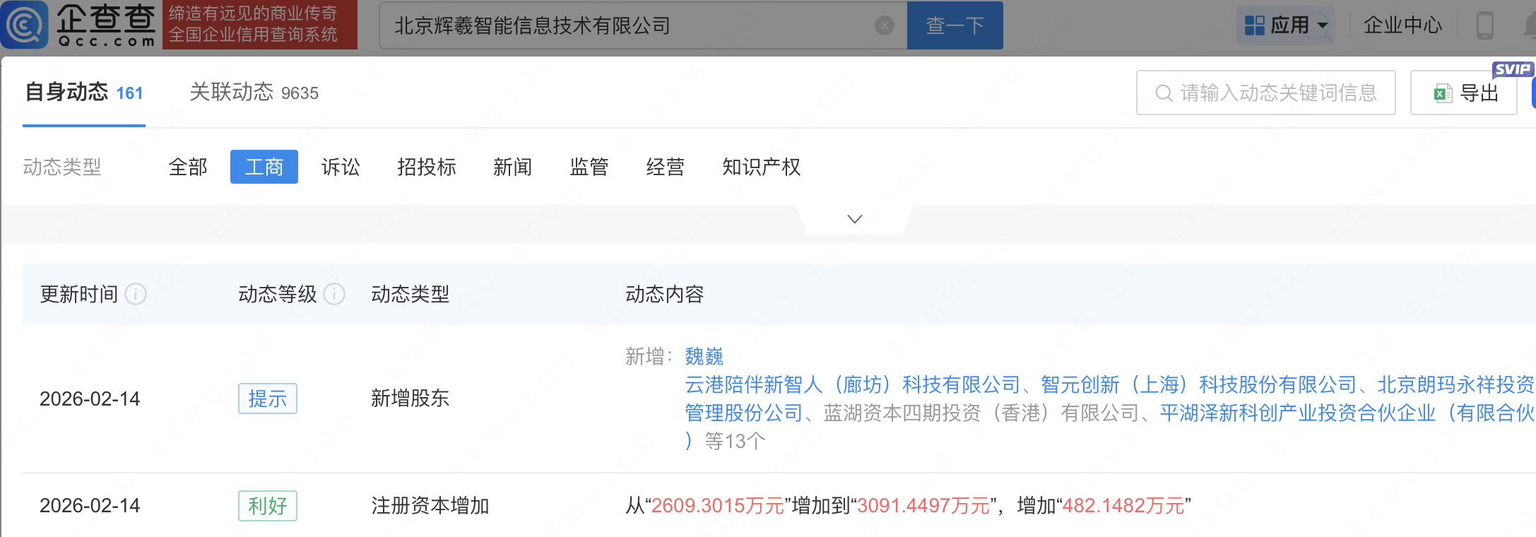 企查查APP显示,近日,北京辉羲智能信息技术有限公司发生工商变更,新增智元机器人关联公司智元创新(上海)科技股份有限公司等为股东,同时注册资本增至3091.45万元。企查查信息显示,该公司成立于2022年,经营范围包含:人工智能行业应用系统集成服务;人工智能理论与算法软件开发;人工智能硬件销售等。公开信息显示,辉羲智能致力于打造具身智能时代算力平台,提供高算力通用具身智能芯片、易用开放工具链及全栈解决方案。