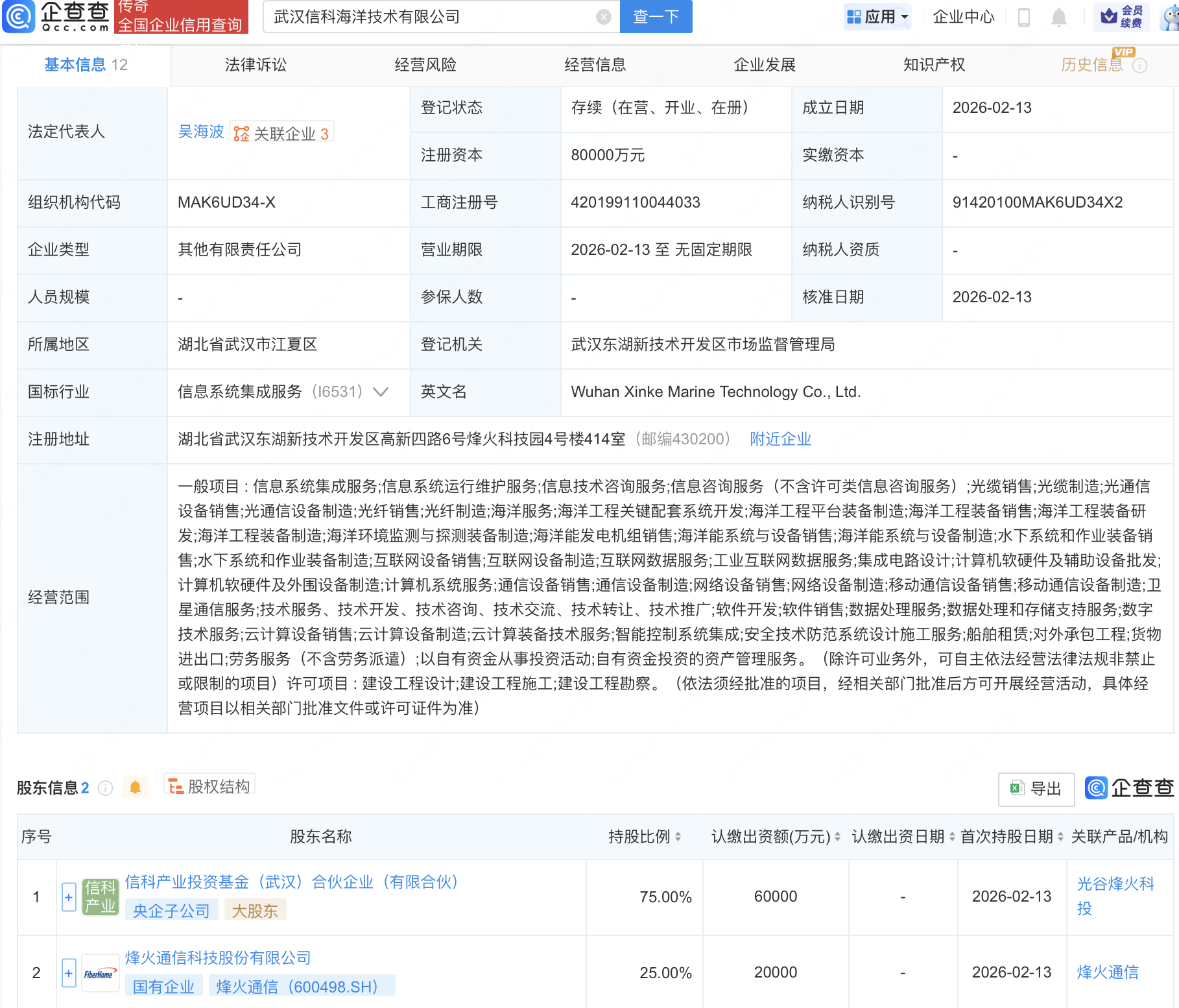 企查查APP显示,近日,武汉信科海洋技术有限公司成立,注册资本8亿元,经营范围包含:海洋工程装备制造;海洋环境监测与探测装备制造;海洋能发电机组销售;海洋能系统与设备销售等。企查查股权穿透显示,该公司由烽火通信(600498)等共同持股。