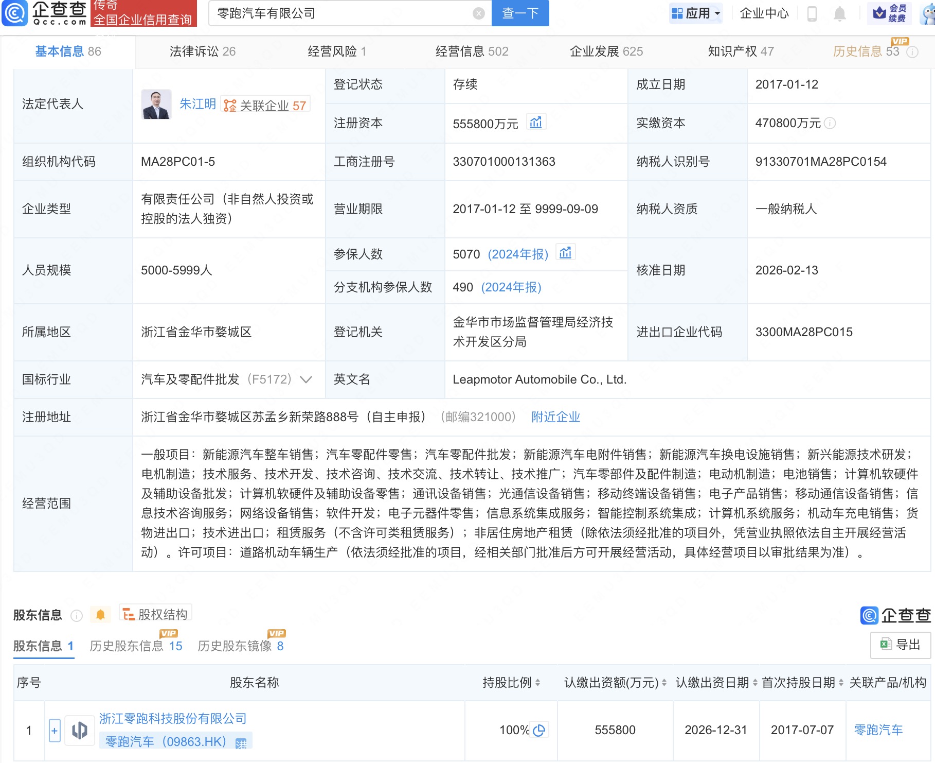 企查查APP显示,近日,零跑汽车有限公司发生工商变更,注册资本由47.08亿人民币增至55.58亿人民币,朱江明由执行董事改任董事,同时,多位高管发生变更。企查查信息显示,该公司成立于2017年,由零跑汽车(09863.HK)全资持股。