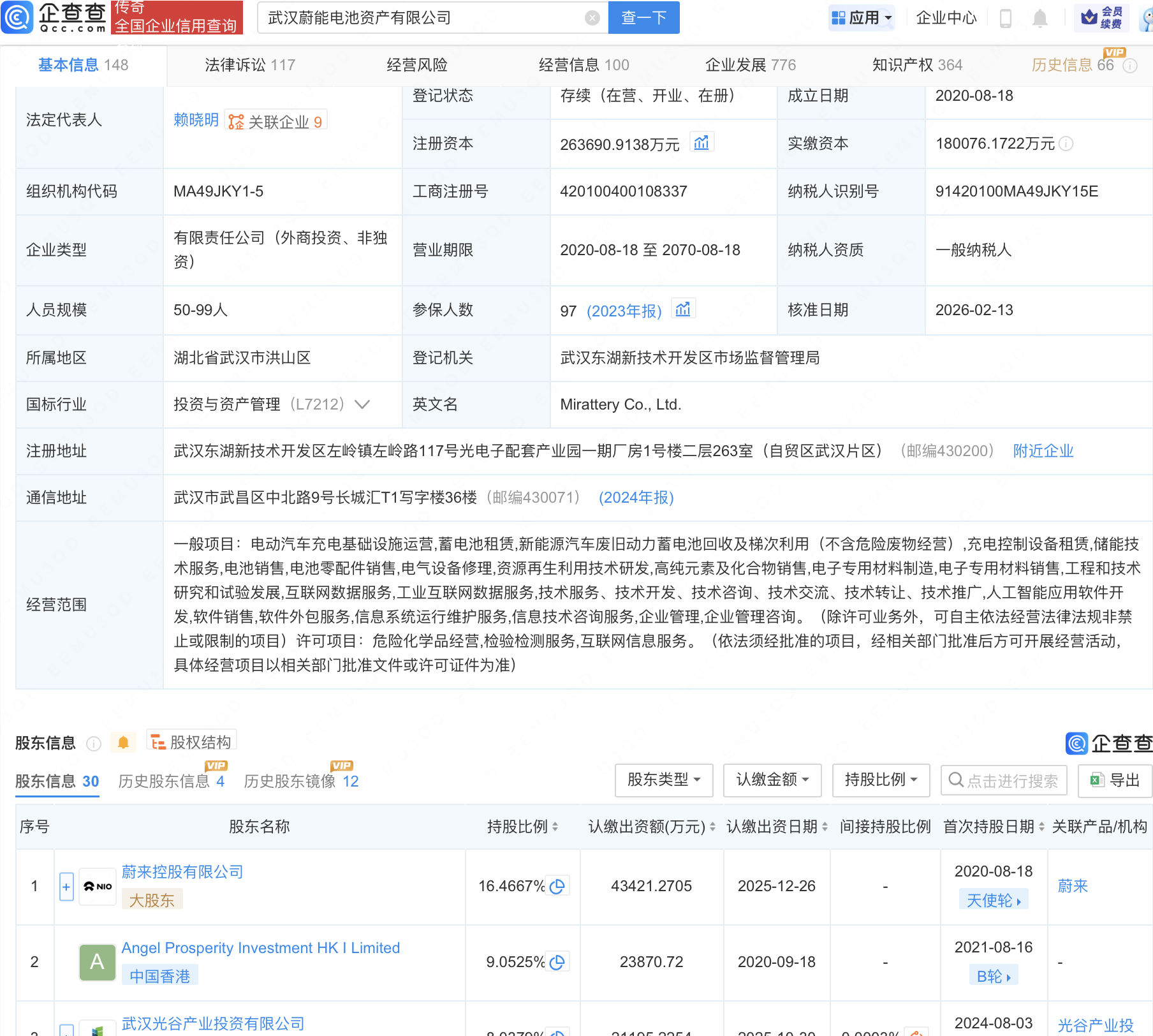 企查查APP显示,近日,武汉蔚能电池资产有限公司发生工商变更,新增合肥建投新兴产业股权投资基金合伙企业(有限合伙)、合肥海恒新兴产业股权投资基金合伙企业(有限合伙)为股东,同时注册资本由约22.39亿元增至约26.37亿元。企查查信息显示,该公司成立于2020年,经营范围包含:电动汽车充电基础设施运营,蓄电池租赁,人工智能应用软件开发等。