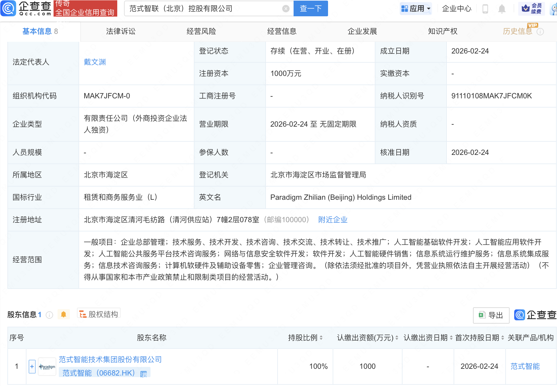 企查查APP显示,近日,范式智联(北京)控股有限公司成立,注册资本1000万元,经营范围包含:人工智能基础软件开发;人工智能应用软件开发;人工智能公共服务平台技术咨询服务;网络与信息安全软件开发等。企查查股权穿透显示,该公司由范式智能(06682.HK)全资持股。