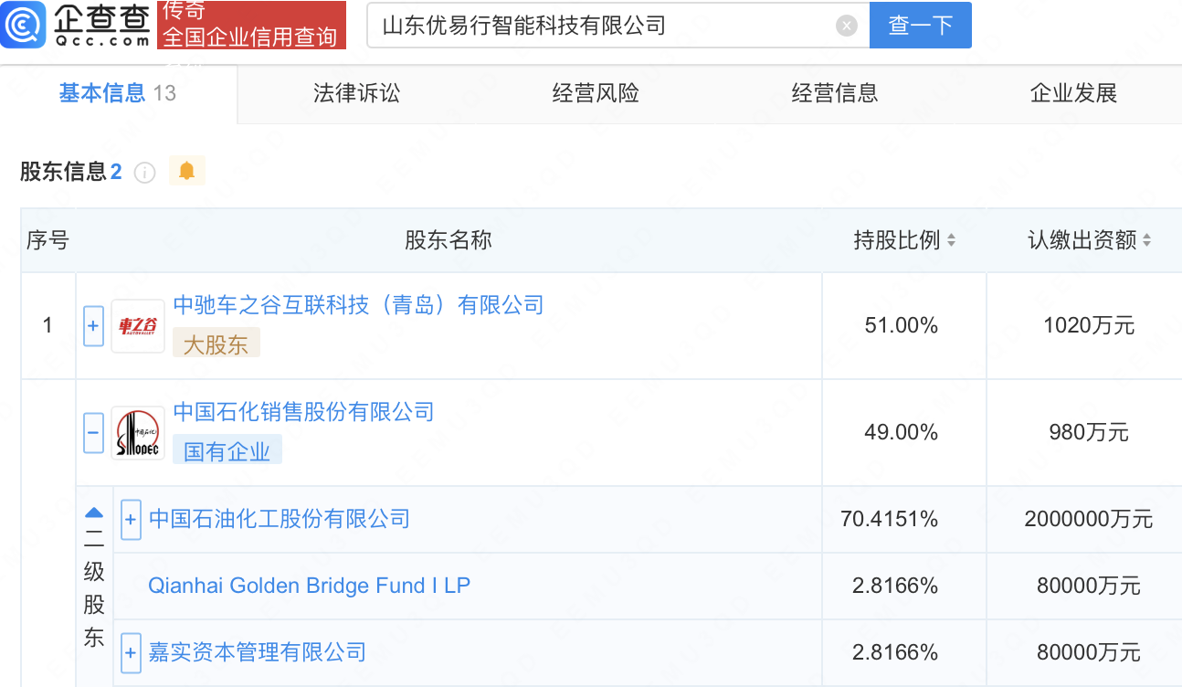 企查查APP显示,近日,山东优易行智能科技有限公司成立,注册资本2000万元,经营范围包含:人工智能行业应用系统集成服务;软件销售;软件外包服务;计算机软硬件及辅助设备零售等。企查查股权穿透显示,该公司由中国石化(600028)旗下中国石化销售股份有限公司等共同持股。