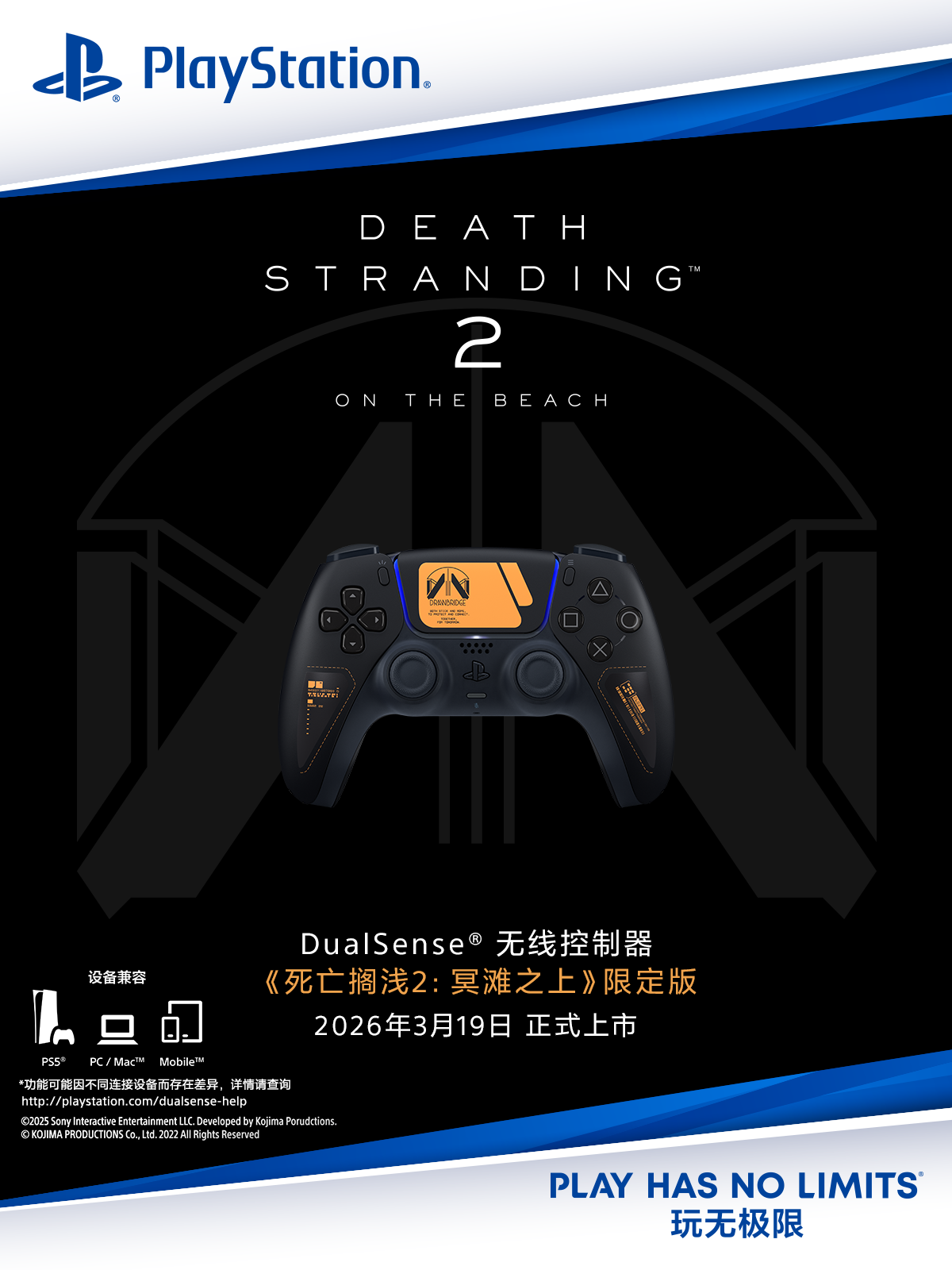 压轴登场的DualSense®无线控制器 -《死亡搁浅2:冥滩之上》限定版将于3月12日启动预售,3月19日正式发售。这款与小岛秀夫工作室联合打造的产品,以游戏核心元素"卓布里吉"的橘色徽章作为视觉焦点,通过磨砂与亮面材质的对比呈现独特质感。控制器内置双震感马达与可调阻力扳机键,可模拟游戏中不同装备的使用反馈。技术参数显示其配备1560mAh锂离子电池,支持48kHz高清音频输出,重量控制在280克以内。该限定版同样定价639元,购买即附专属使用说明书。