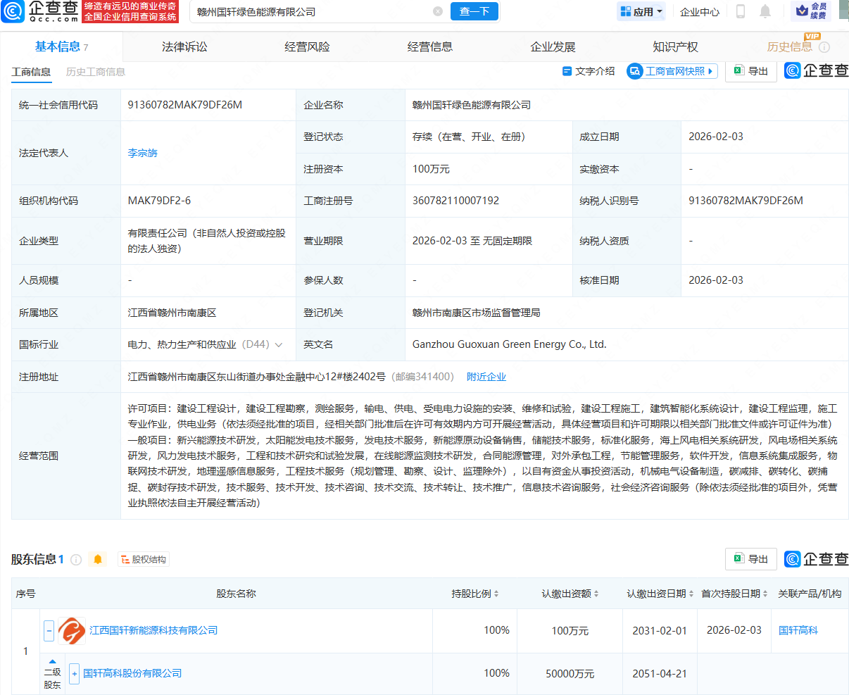企查查APP显示,近日,赣州国轩绿色能源有限公司成立,法定代表人为李宗旃,经营范围包含:新兴能源技术研发,太阳能发电技术服务,发电技术服务,新能源原动设备销售,储能技术服务等。企查查股权穿透显示,该公司由国轩高科(002074)间接全资持股。