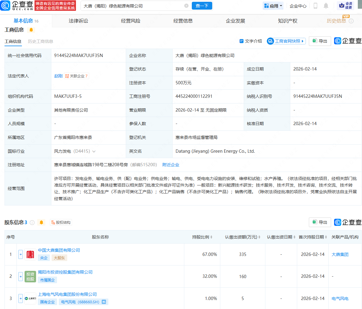 企查查APP显示,近日,大唐(揭阳)绿色能源有限公司成立,法定代表人为赵刚,经营范围包含:发电业务、输电业务、供(配)电业务;供电业务;新兴能源技术研发等。企查查股权穿透显示,该公司由中国大唐集团有限公司、电气风电(688660)等共同持股。