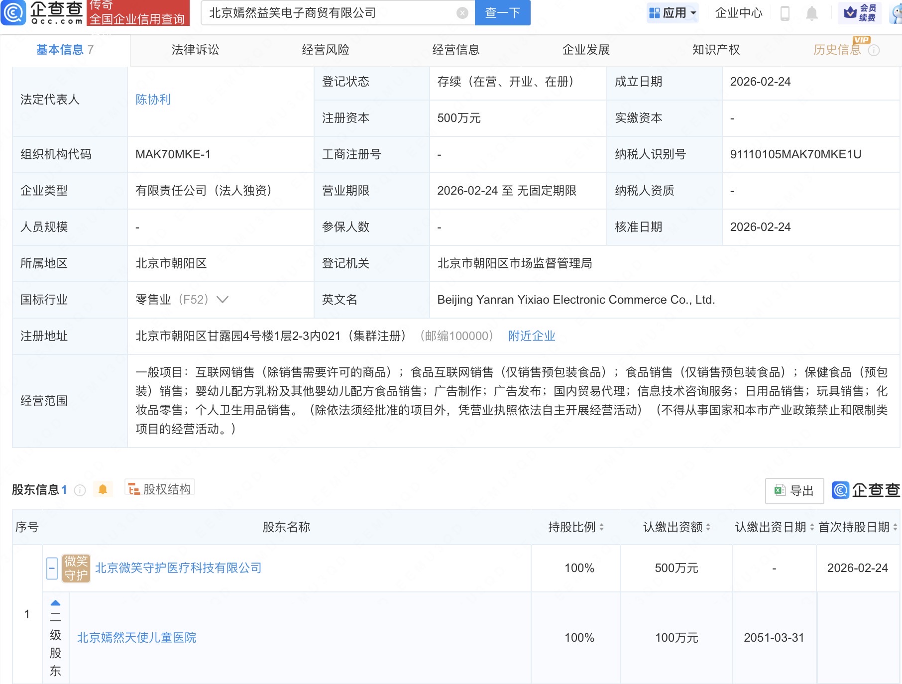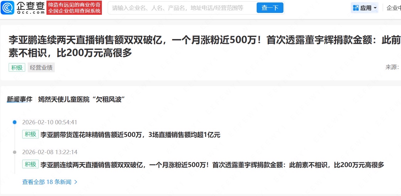 企查查APP显示,近日,北京嫣然益笑电子商贸有限公司成立,法定代表人为陈协利,注册资本500万元,经营范围含互联网销售、婴幼儿配方乳粉及其他婴幼儿配方食品销售等,由北京嫣然天使儿童医院间接全资持股,后者法定代表人为李亚鹏。据悉,李亚鹏在2月6日和7日的直播中销售额均破亿,一个月涨粉近500万。