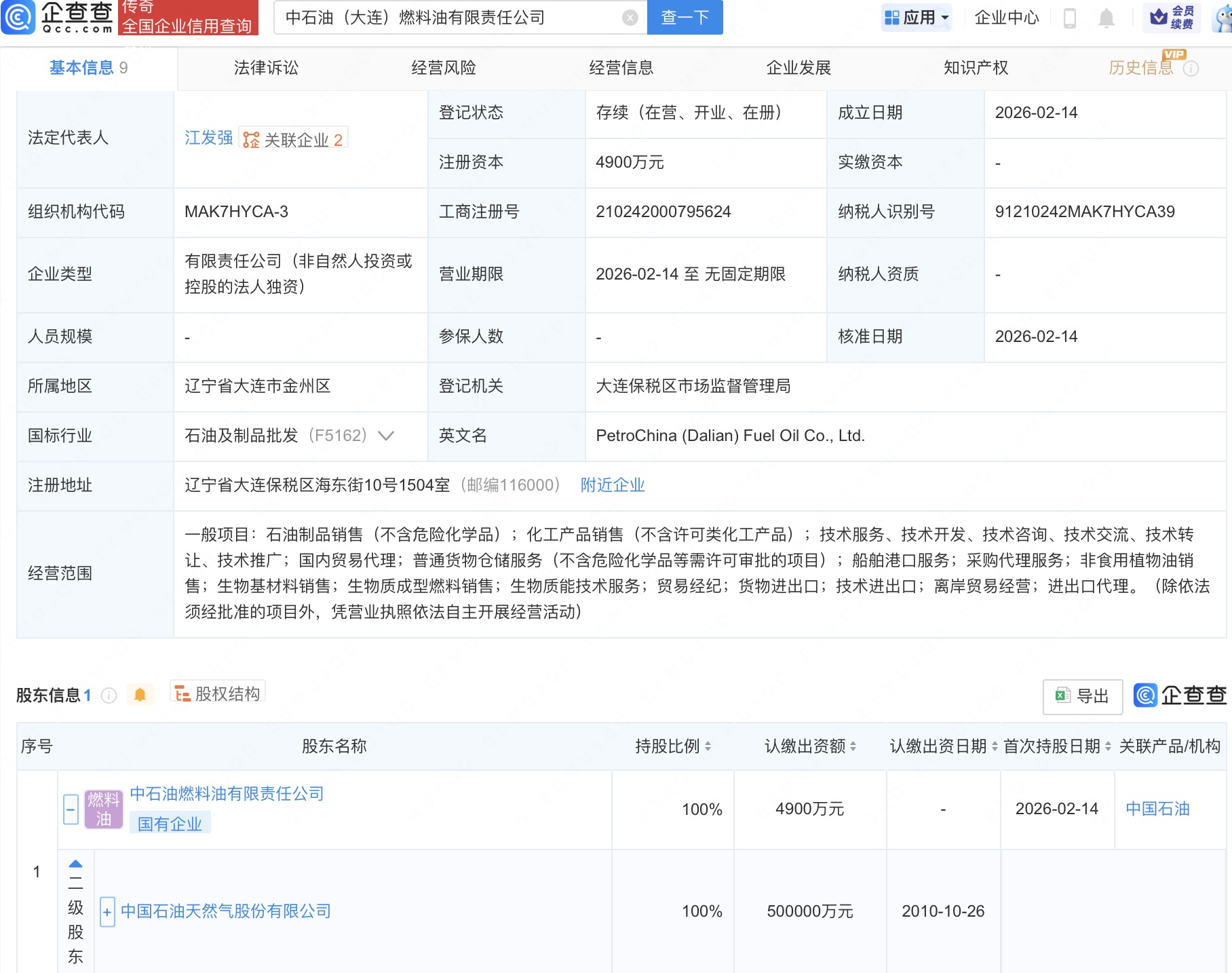 企查查APP显示,近日,中石油(大连)燃料油有限责任公司成立,法定代表人为江发强,注册资本4900万人民币,经营范围含生物基材料销售、生物质成型燃料销售、贸易经纪等。企查查股权穿透显示,该公司由中国石油(601857)旗下中石油燃料油有限责任公司全资持股。