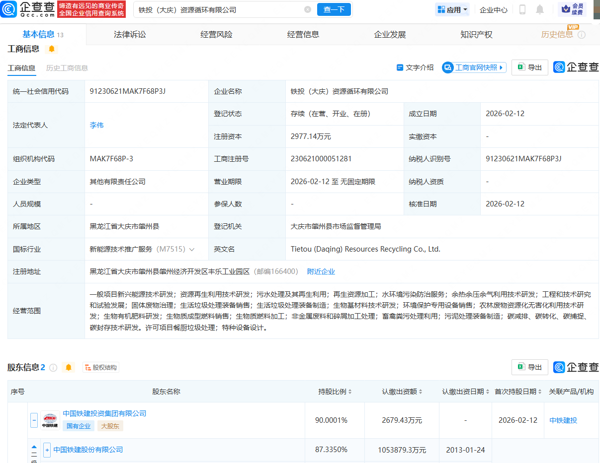 企查查APP显示,近日,铁投(大庆)资源循环有限公司成立,法定代表人为李伟,注册资本为2977.14万元,经营范围包含:新兴能源技术研发;资源再生利用技术研发;污水处理及其再生利用;再生资源加工;生物质燃料加工等。企查查股权穿透显示,该公司由中国铁建(601186)旗下中国铁建投资集团有限公司等共同持股。