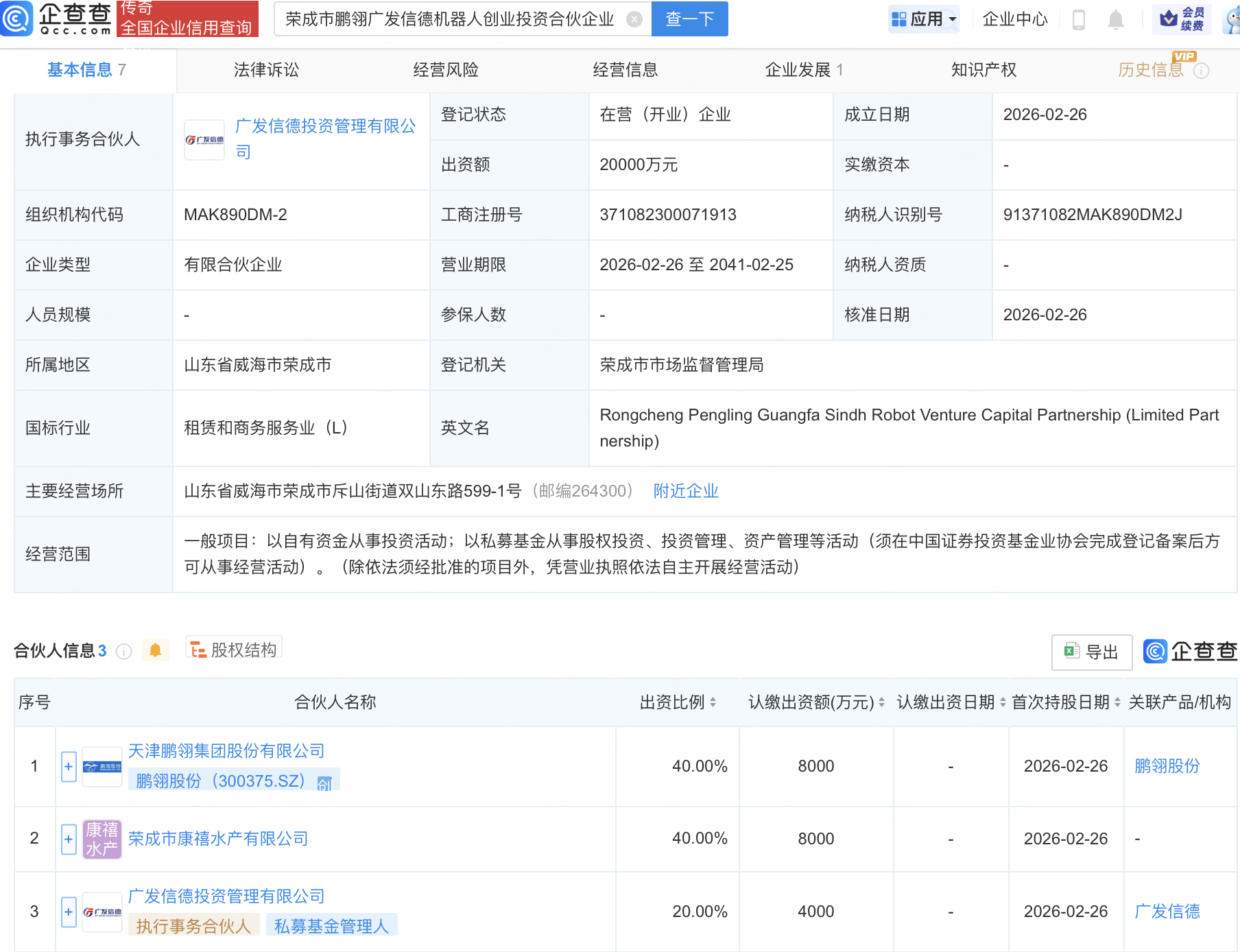 企查查APP显示,近日,荣成市鹏翎广发信德机器人创业投资合伙企业(有限合伙)成立,出资额2亿元,经营范围包含:以自有资金从事投资活动;以私募基金从事股权投资、投资管理、资产管理等活动。企查查股权穿透显示,该企业由鹏翎股份(300375)等共同出资。