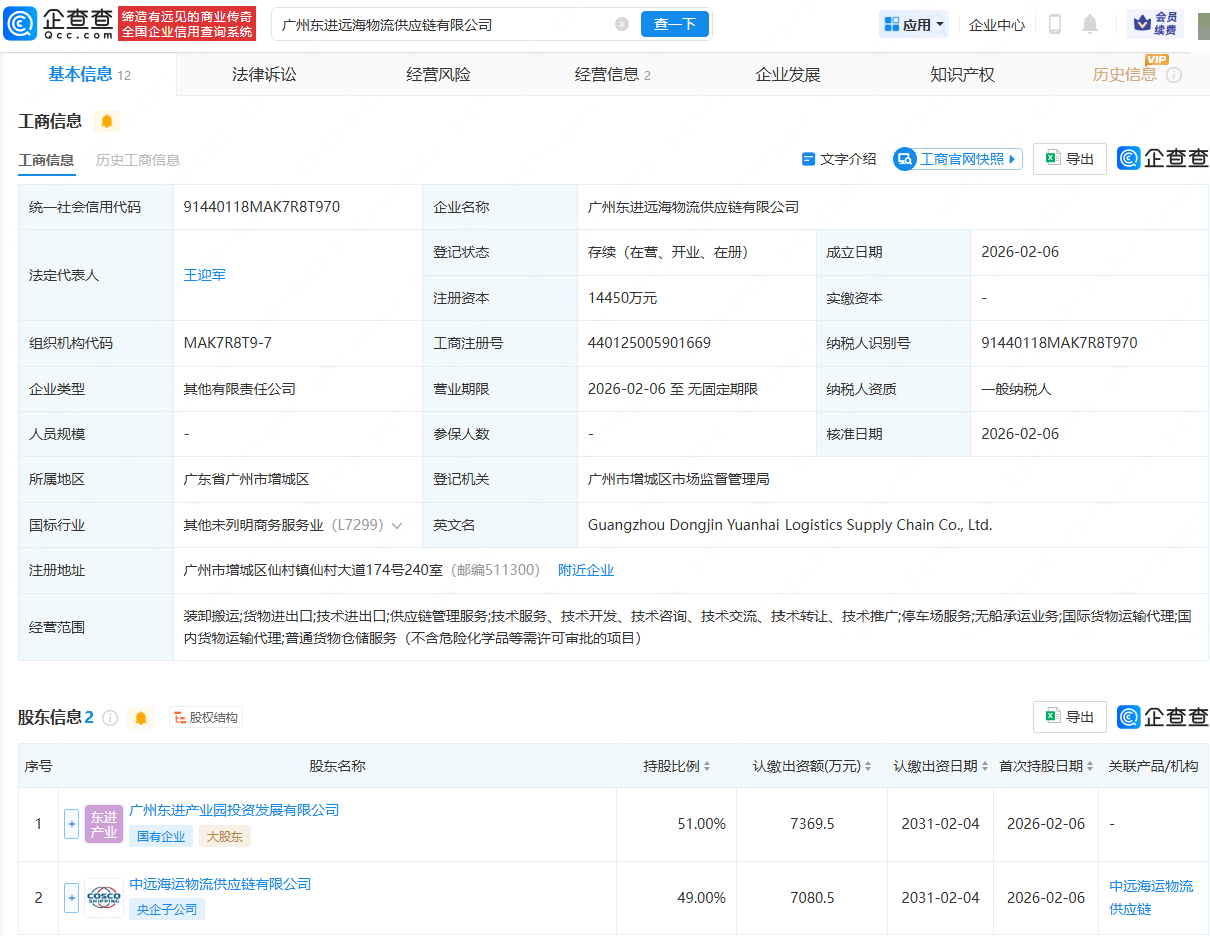 企查查APP显示,近日,广州东进远海物流供应链有限公司成立,法定代表人为王迎军,注册资本约为1.45亿元,经营范围包含:供应链管理服务;停车场服务;无船承运业务;国际货物运输代理;国内货物运输代理等。企查查股权穿透显示,该公司由广州东进产业园投资发展有限公司、中远海运物流供应链有限公司共同持股。