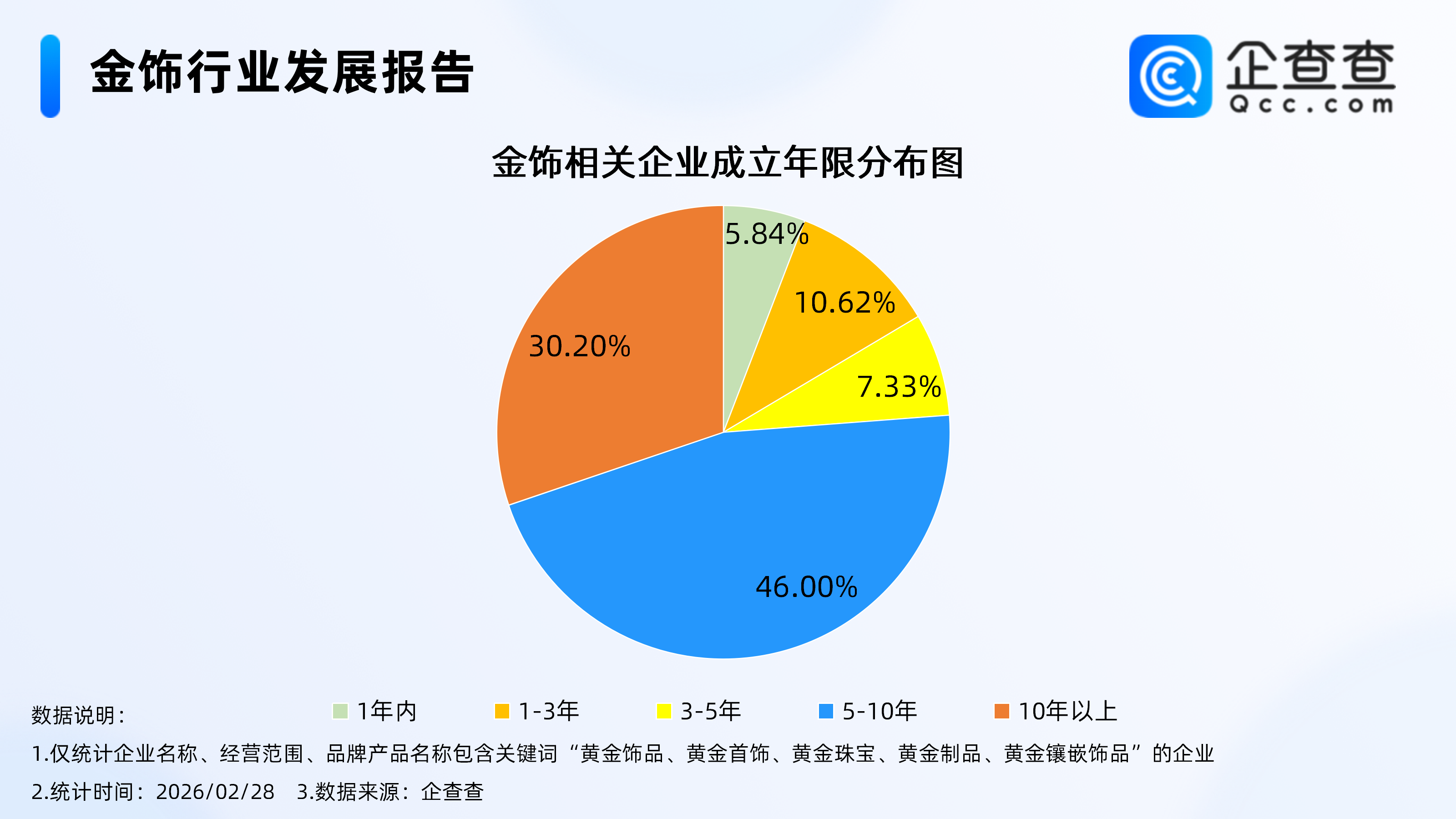 企查查数据显示,从经营时间来看,金饰相关现存企业多为老牌企业,近8成相关企业成立五年以上,其中成立年限在5-10年的相关企业最多,占比46.00%,在10年以上的相关企业占比30.20%。