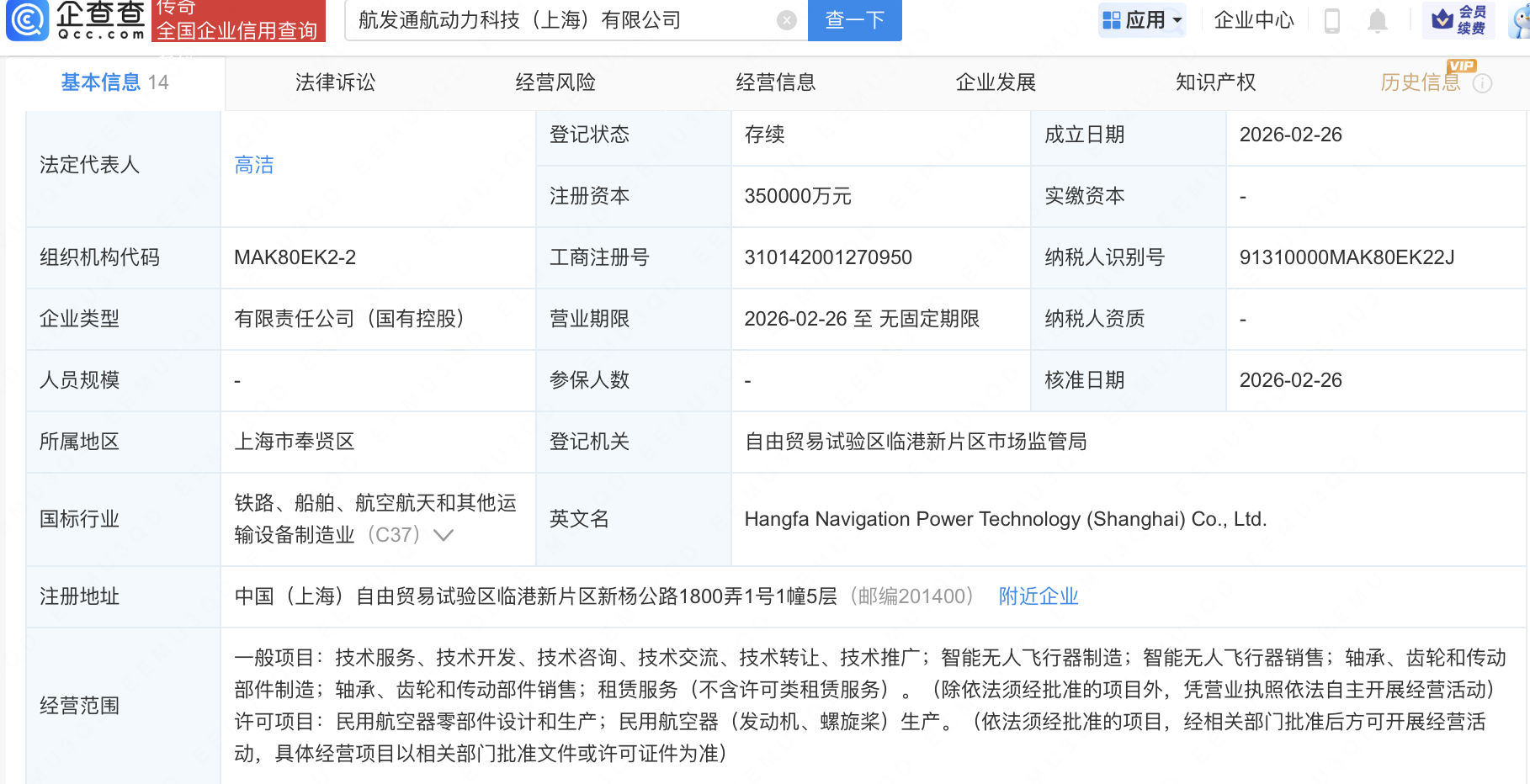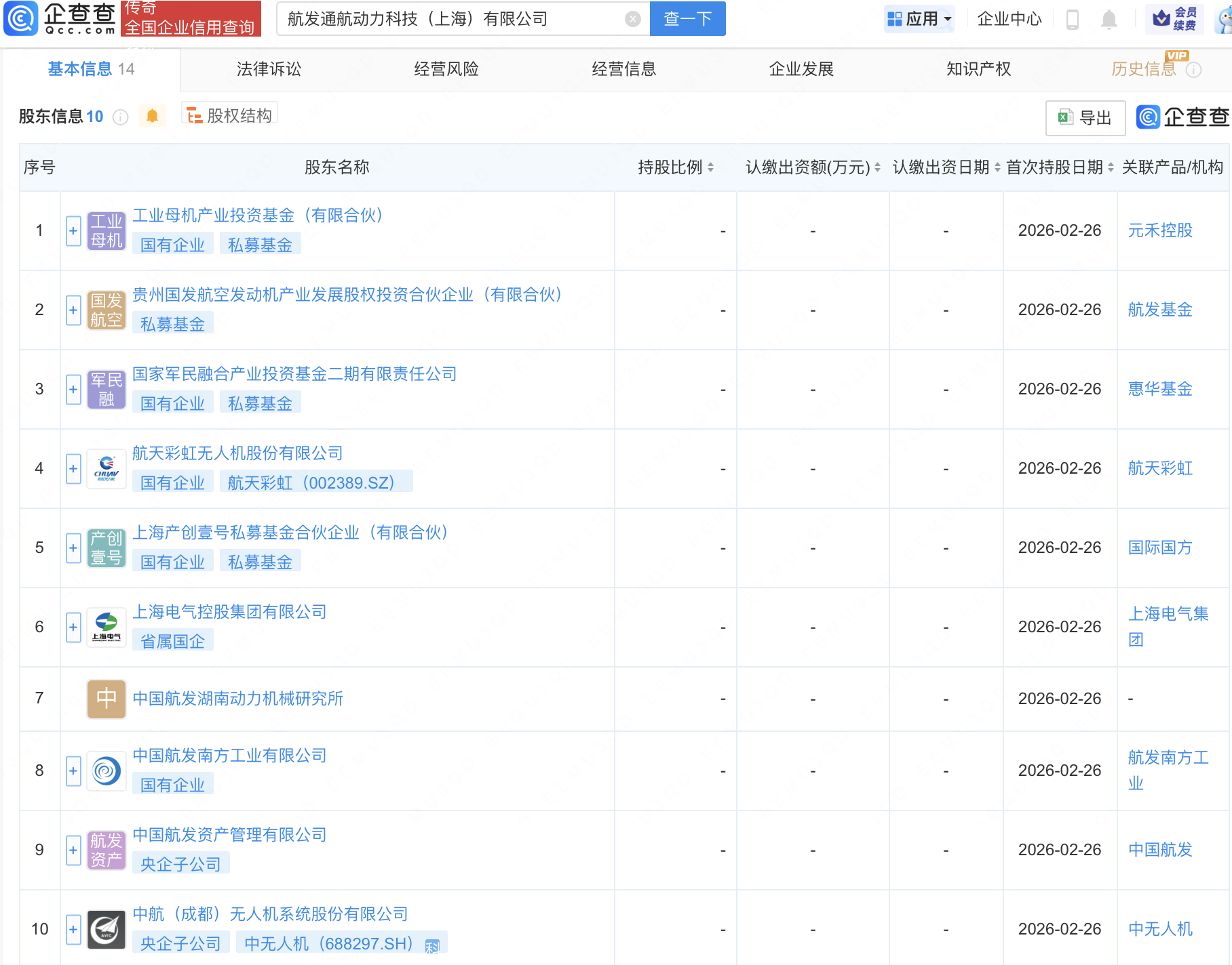 企查查APP显示,近日,航发通航动力科技(上海)有限公司成立,注册资本35亿元,经营范围包含:智能无人飞行器制造;智能无人飞行器销售;民用航空器零部件设计和生产;民用航空器(发动机、螺旋桨)生产等。企查查股权穿透显示,该公司由航天彩虹(002389)、中无人机(688297)等共同持股。