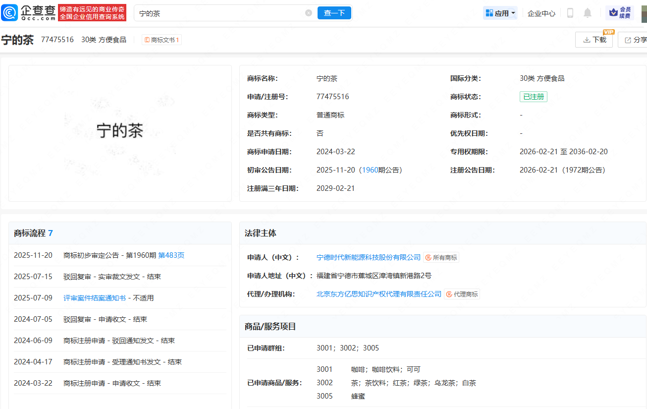 企查查APP显示,近日,宁德时代(300750)申请的“宁的茶”商标注册成功,国际分类为30类 方便食品,已申请商品/服务包括:咖啡;咖啡饮料;可可;茶;茶饮料;红茶等。