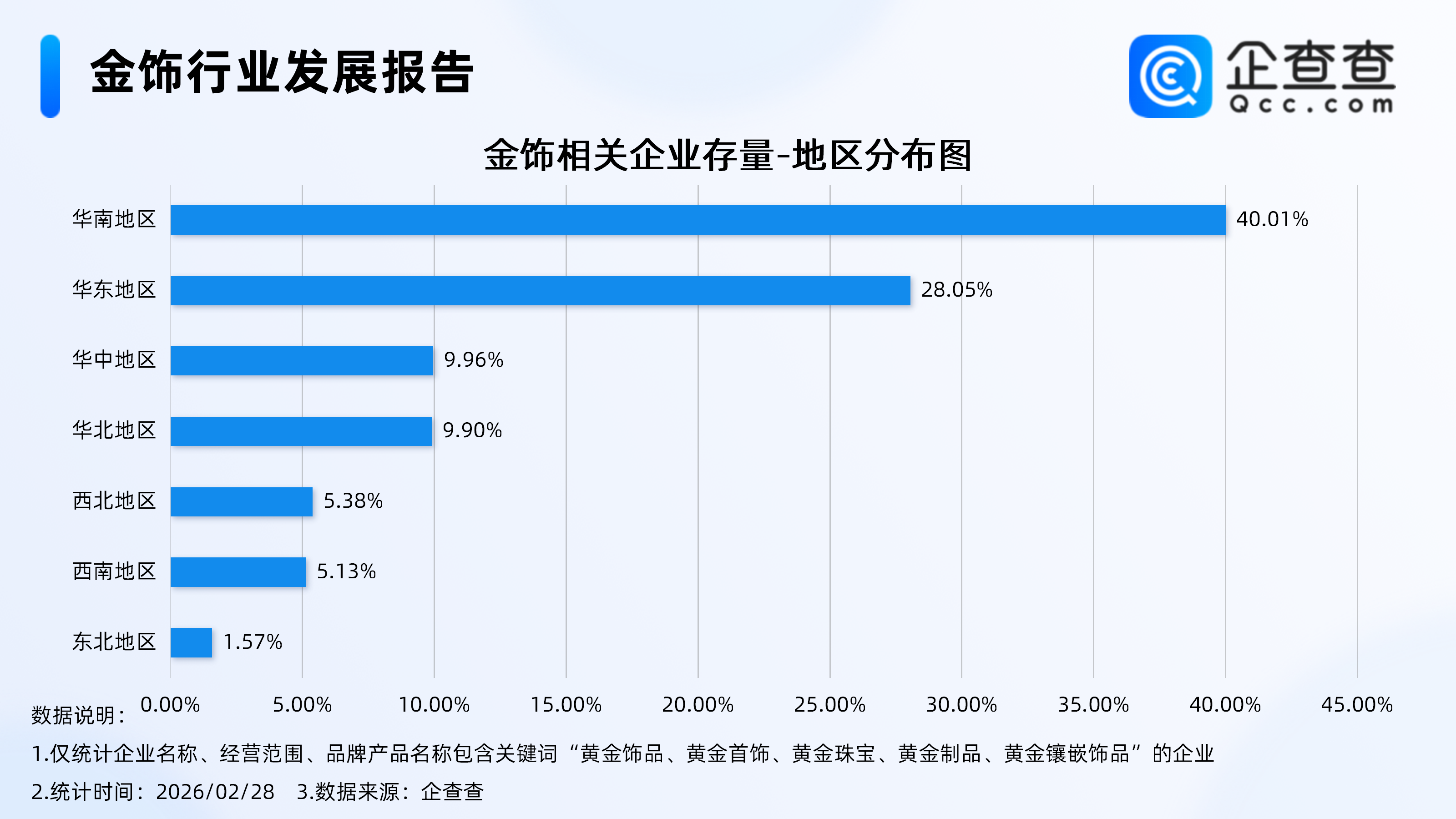 企查查数据显示,截至2月底,国内现存金饰相关企业6.19万家。注册量方面,2025年全年注册3902家相关企业,截至目前,今年已注册475家。存量方面,从经营时间来看,金饰相关企业多为老牌企业,近8成相关企业成立五年以上,其中成立年限在5-10年的相关企业最多,占比46.00%。从地区分布来看,金饰相关企业主要集中分布在华南地区,占比达40.01%。