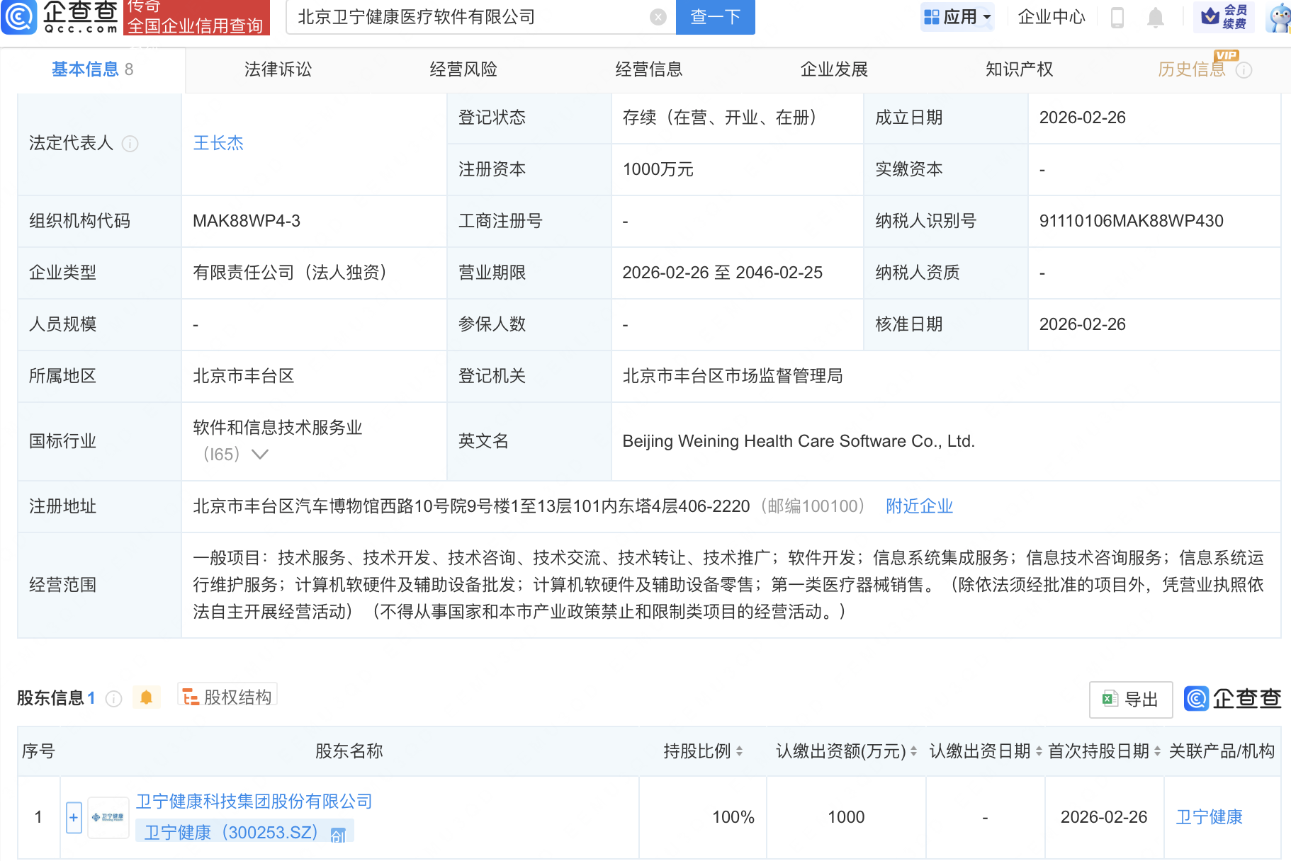 企查查APP显示,近日,北京卫宁健康医疗软件有限公司成立,注册资本1000万元,经营范围包含:软件开发;信息系统集成服务;信息技术咨询服务;信息系统运行维护服务等。企查查股权穿透显示,该公司由卫宁健康(300253)全资持股。