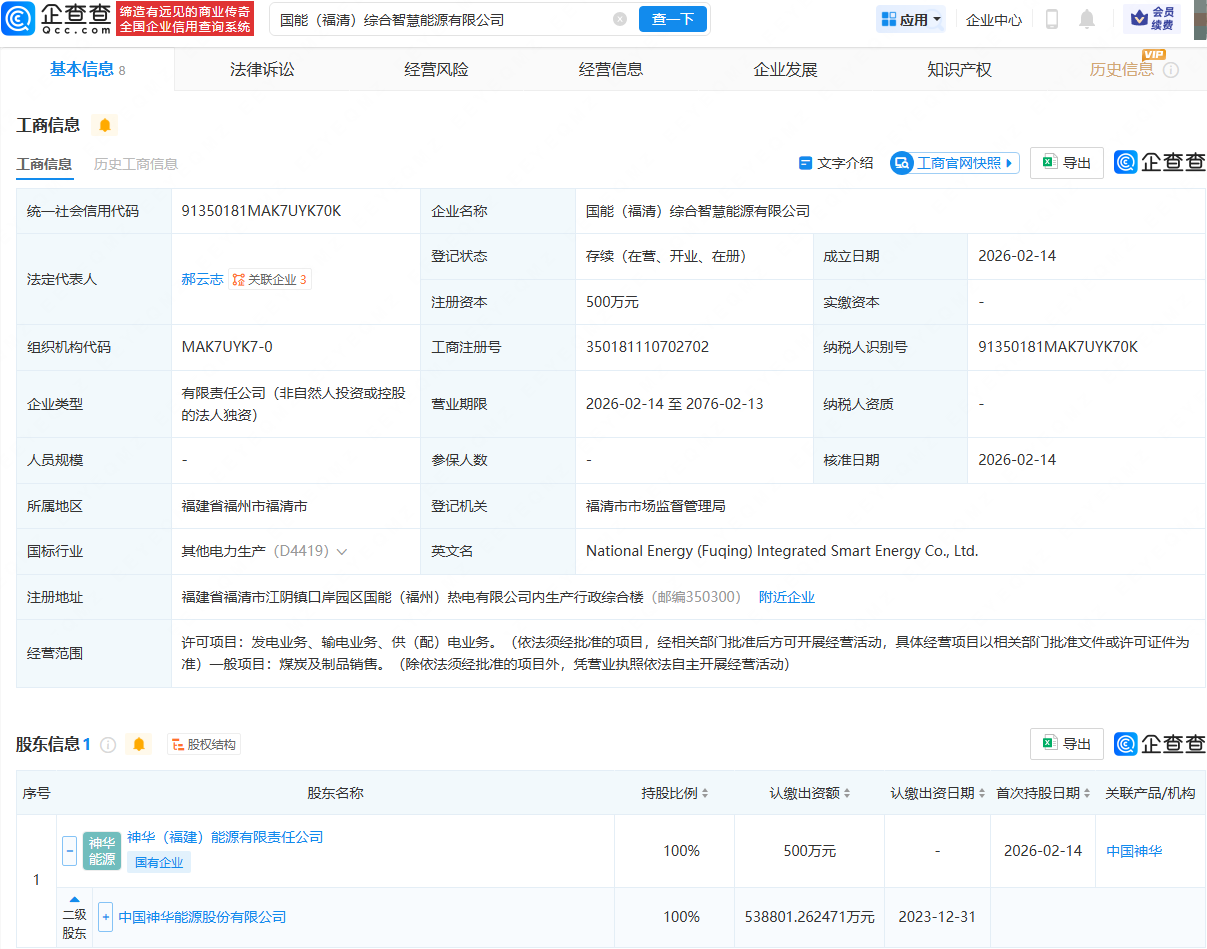 企查查APP显示,近日,国能(福清)综合智慧能源有限公司成立,法定代表人为郝云志,经营范围包含:发电业务、输电业务、供(配)电业务;煤炭及制品销售。企查查股权穿透显示,该公司由中国神华(601088)间接全资持股。