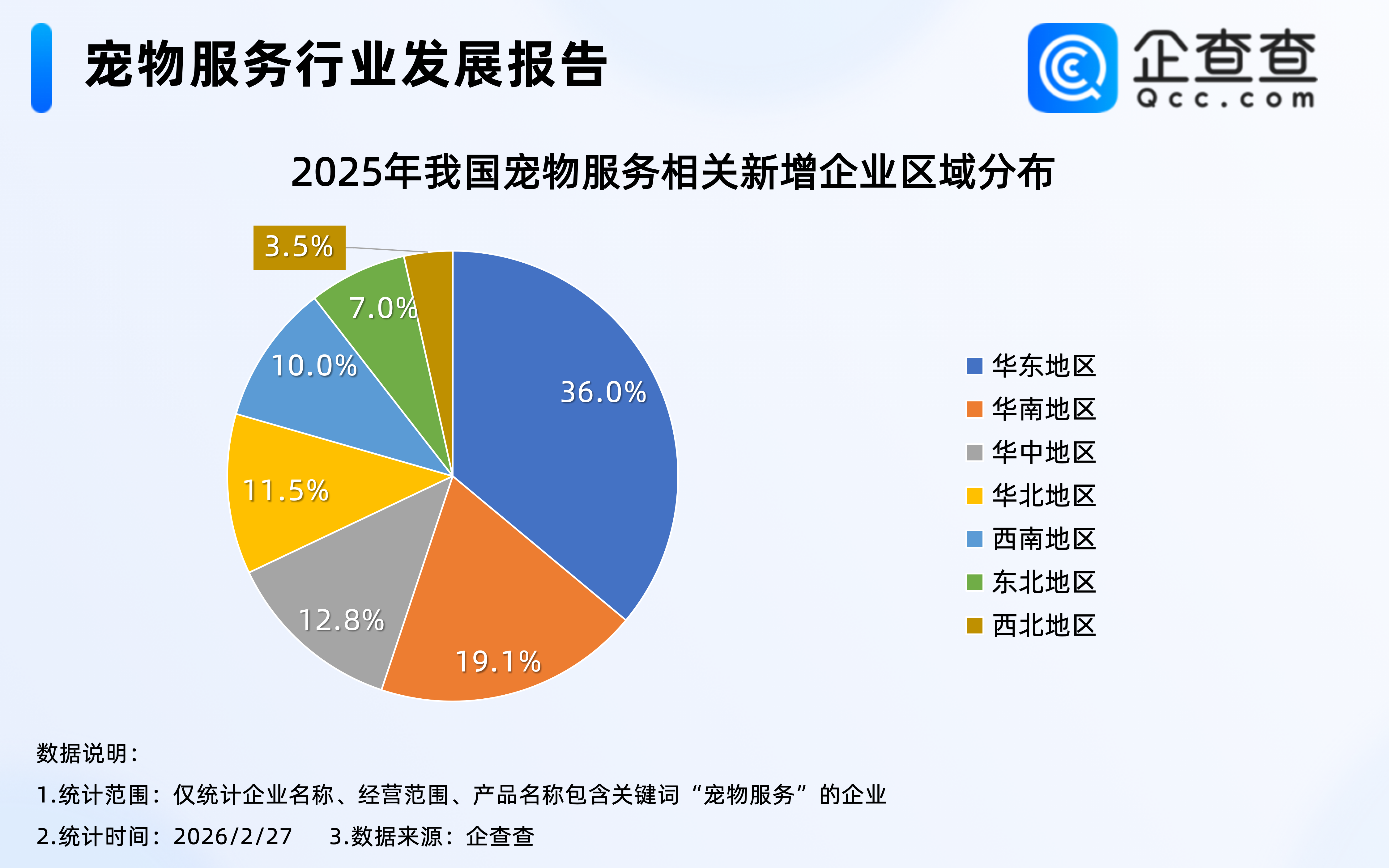 企查查数据显示,2025年注册的13.9万家宠物服务相关企业中,位于华东地区的相关企业最多,占比达36.0%,其次是华南地区,占比19.1%,西北地区2025年宠物服务相关企业注册量相对最少,占比3.5%。
