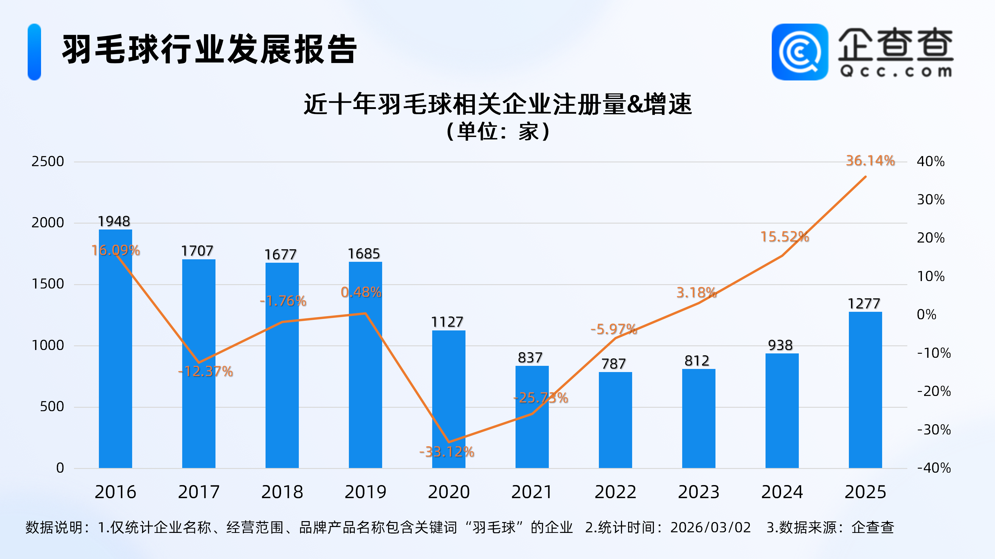 企查查数据显示,截至3月2日,国内现存羽毛球相关企业1.36万家,近十年羽毛球相关企业注册量呈先减后增态势,2025年全年注册量同比增长36.14%至1277家,达近十年注册增速峰值。截至目前,今年已注册131家相关企业。