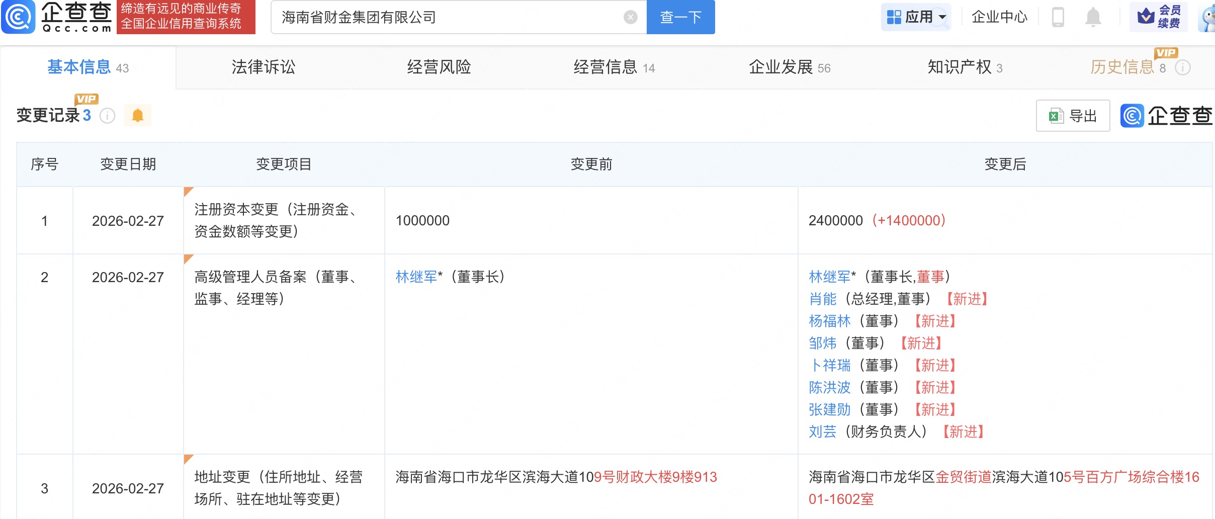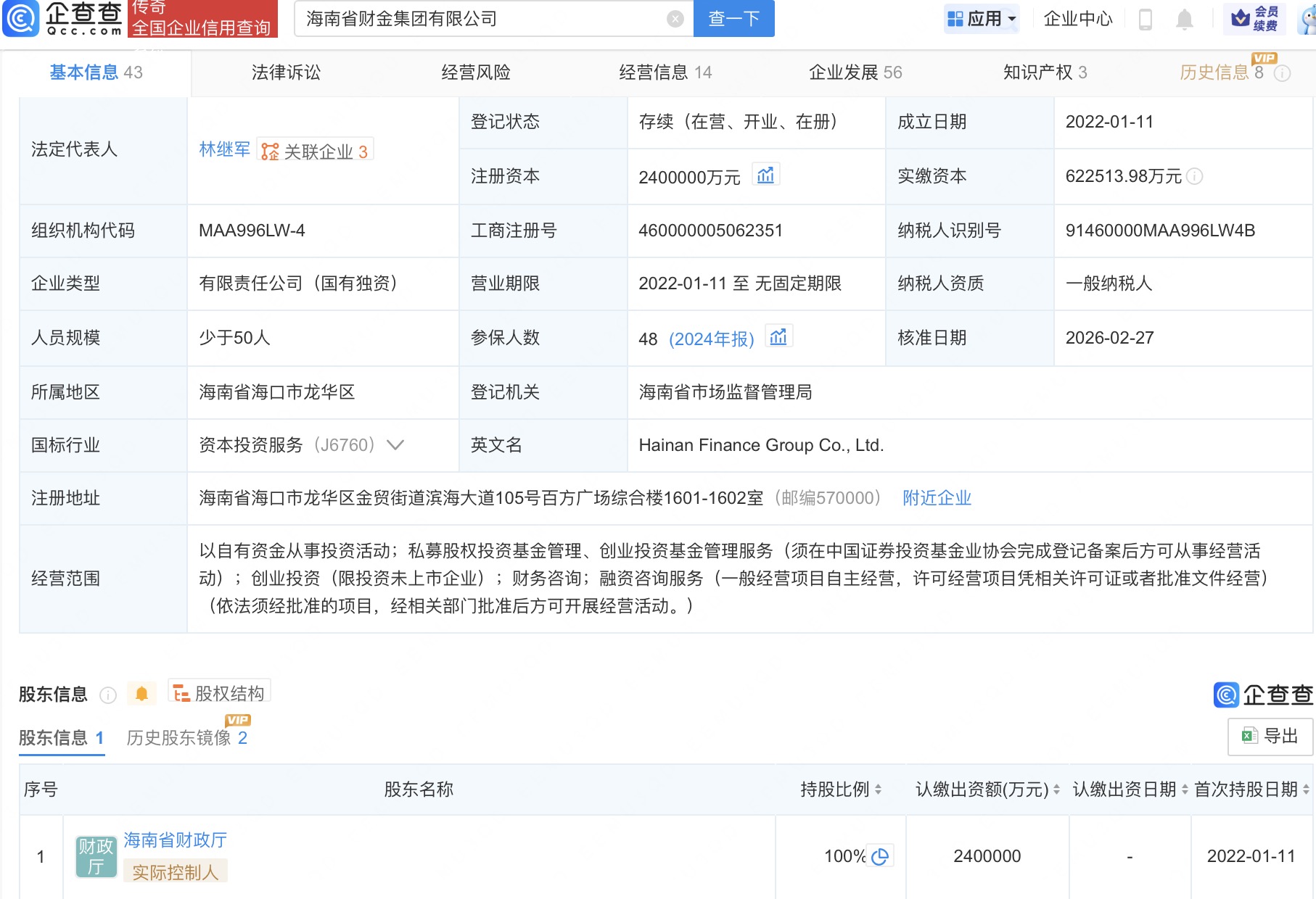 企查查APP显示,近日,海南省财金集团有限公司发生工商变更,注册资本由100亿元增至240亿元,同时,多位高管发生变更。企查查信息显示,该公司成立于2022年1月,法定代表人为林继军,经营范围为以自有资金从事投资活动,私募股权投资基金管理、创业投资基金管理服务,创业投资,财务咨询,融资咨询服务,由海南省财政厅全资持股。