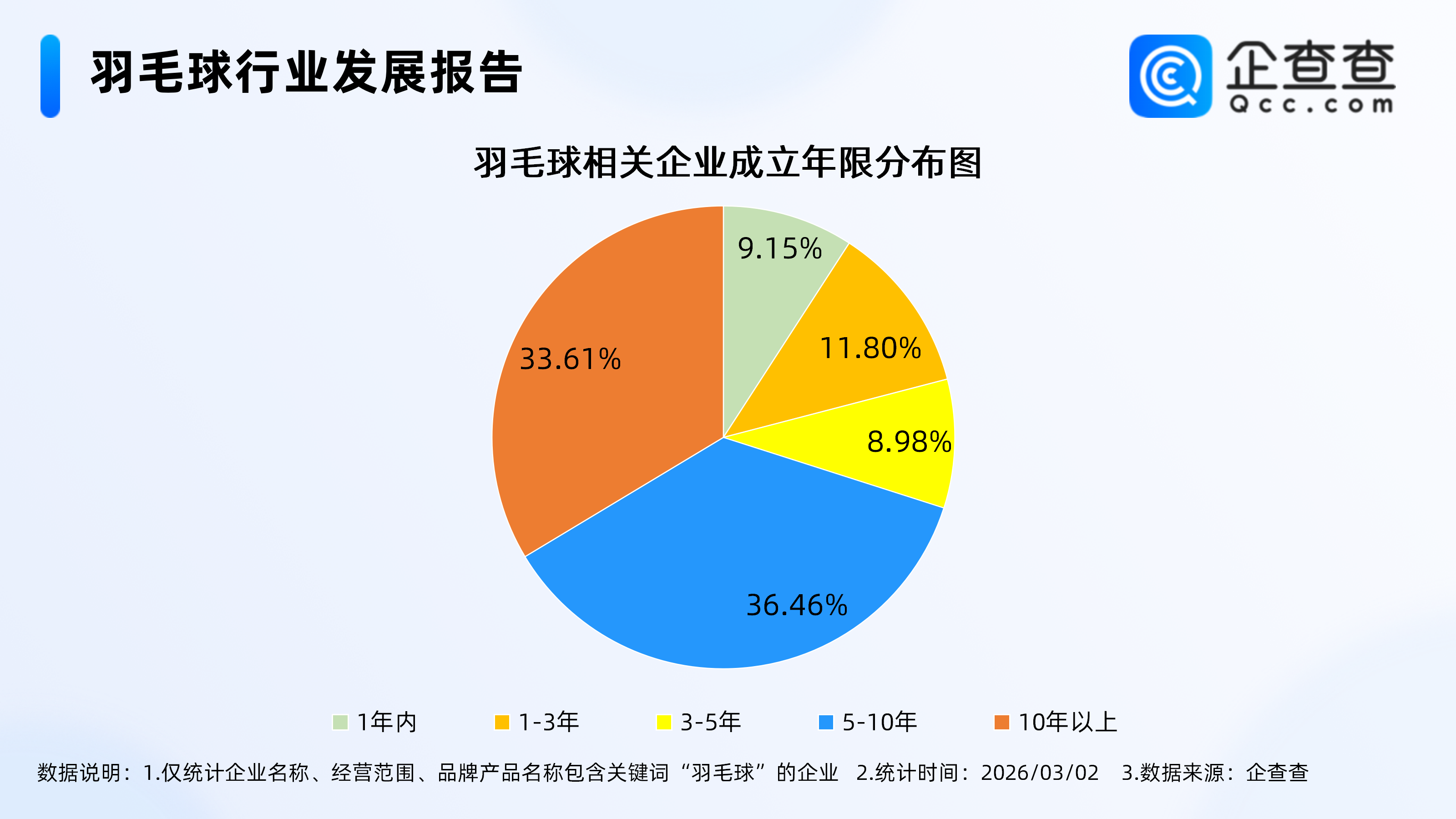 企查查数据显示,从经营时间来看,羽毛球相关现存企业多为老牌企业,成立年限在5-10年的相关企业最多,占比36.46%,成立10年以上的相关企业占比33.61%。