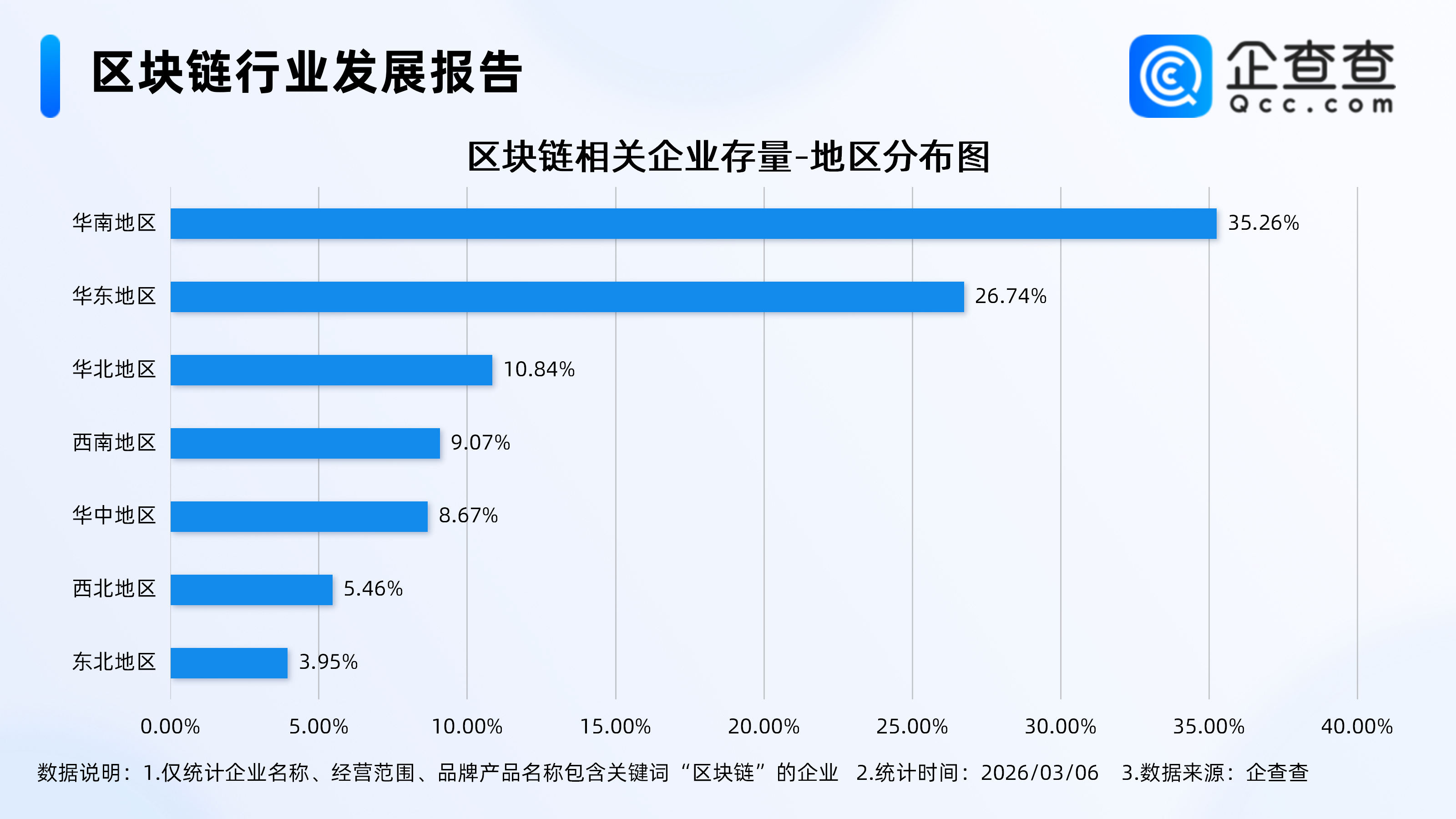 企查查数据显示,从地区分布来看,区块链相关企业的地域集聚效应突出,分布在华南地区的区块链相关企业最多,占比35.26%。其次,华东地区紧随其后,占比26.74%;华北地区占比10.84%。西南、华中、西北、东北地区的相关企业占比均不足10%,分别为9.07%、8.67%、5.46%、3.95%。