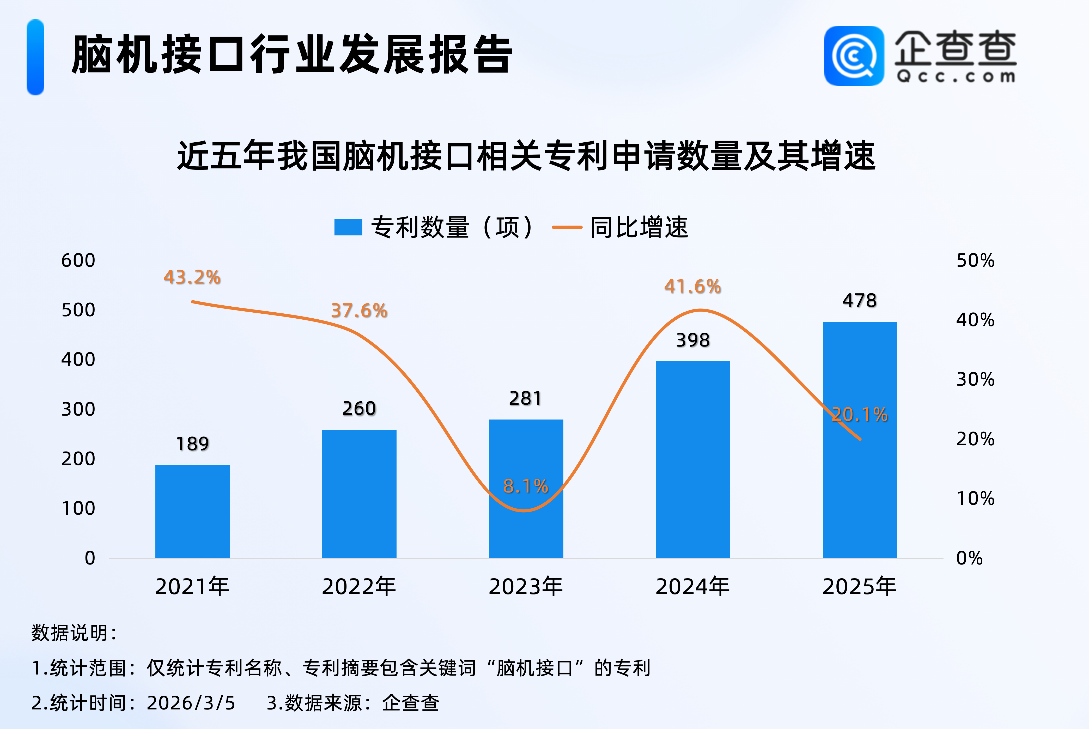 企查查数据显示,截至3月5日,我国现有2165项脑机接口相关专利,类型上以发明公布为主,占比57.7%。近五年(2021年以来)我国累计申请1614项脑机接口相关专利,2025年全年申请478项,同比增加20.1%,相关专利申请量新高。
