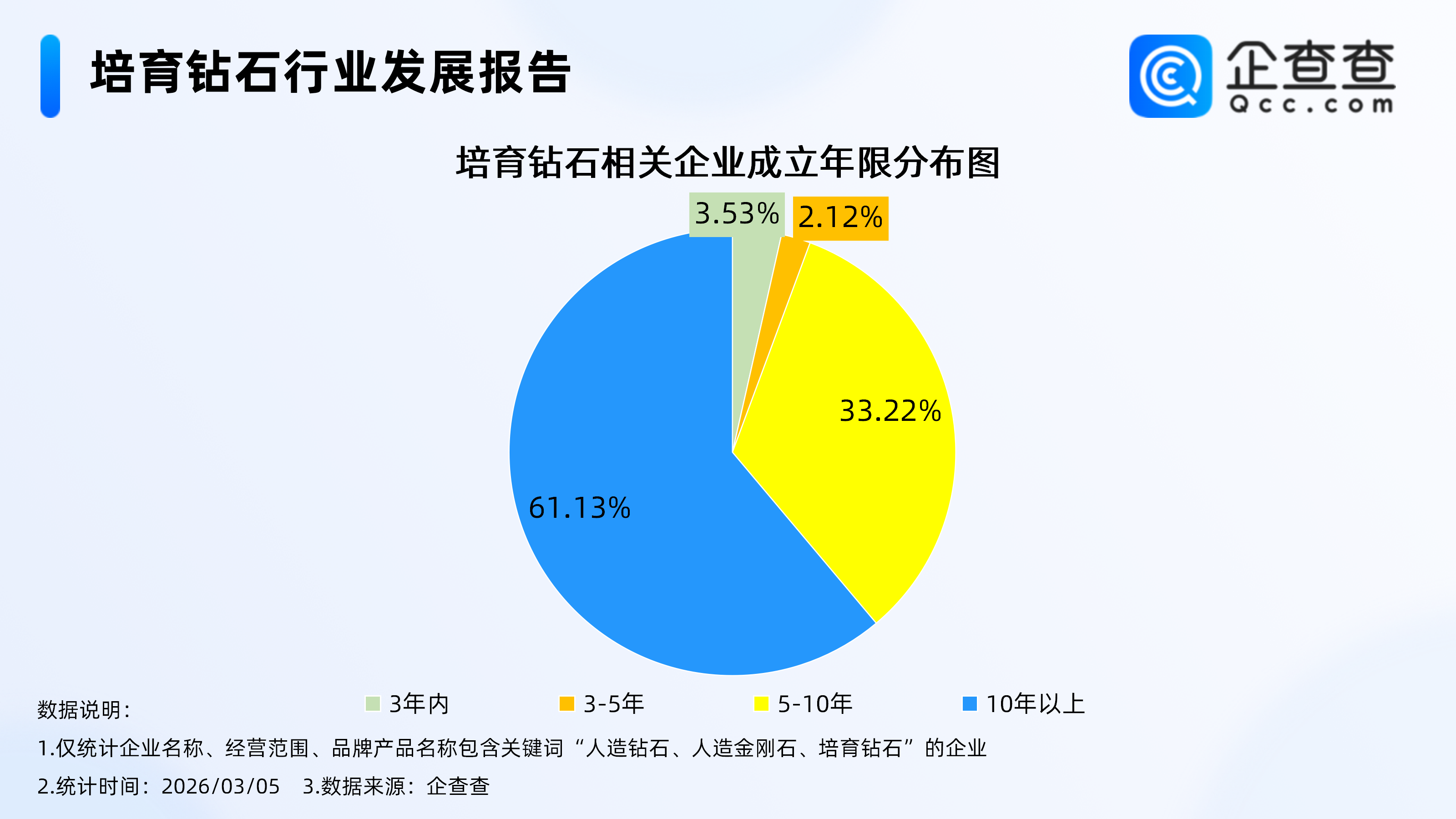 企查查数据显示,截至3月5日,国内现存培育钻石相关企业852家。从经营时间来看,国内培育钻石相关企业以老牌企业为核心主体,行业积淀深厚。其中成立年限在 10 年以上的企业数量最多,占比高达 61.13%;成立年限在 5-10 年的企业次之,占比 33.22%;而成立 3-5 年、3 年内的企业占比相对较少,分别仅为 2.12%、3.53%,老牌企业成为推动行业发展的中坚力量。