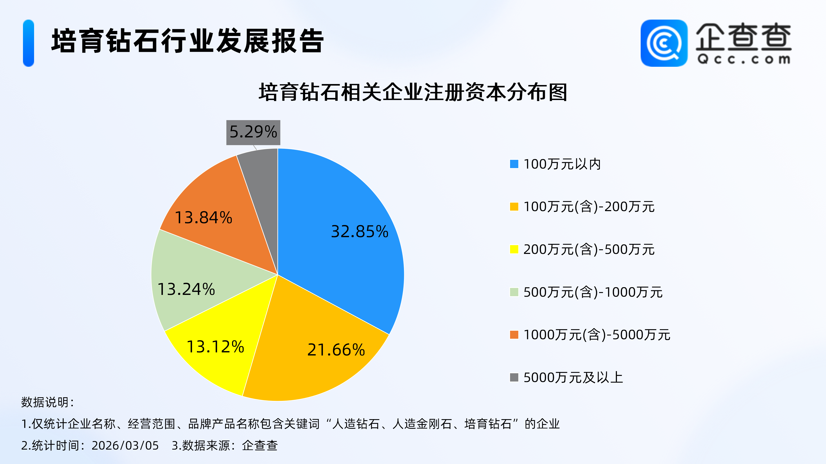 企查查数据显示,从注册资本来看,从注册资本规模来看,国内培育钻石相关企业整体呈现 “轻量级” 特征,中小规模企业占据主流。其中注册资本在 100 万元以内的企业占比最高,达 32.85%;注册资本在 100 万元(含)-200 万元的企业占比 21.66%,位列第二;注册资本 5000 万元及以上的大型企业占比最少,仅为 5.29%。