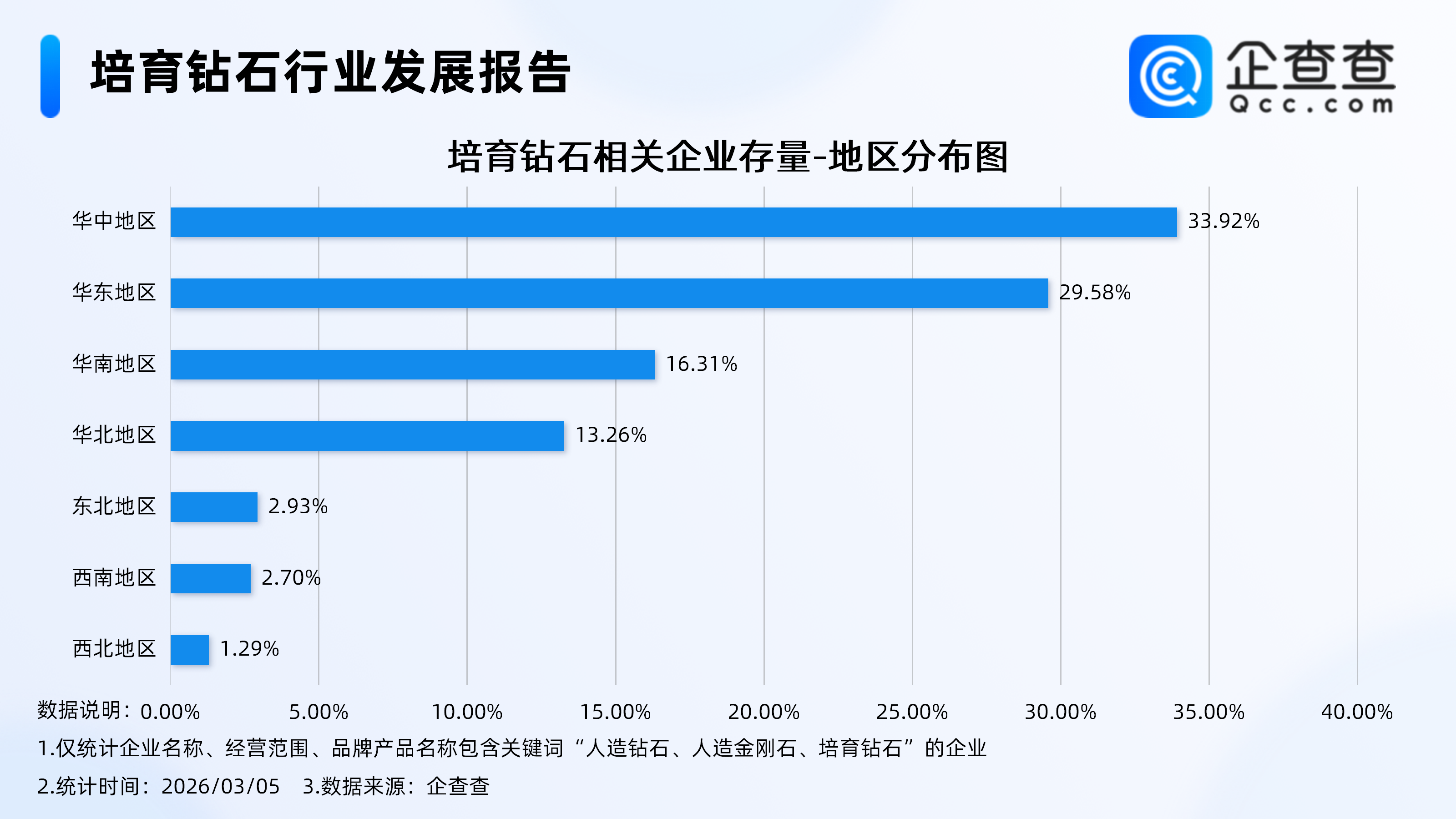 企查查数据显示,从地区分布来看,国内培育钻石相关企业的分布呈现高度集中的特点,华中地区为第一大核心分布地,华东地区紧随其后。其中华中地区的相关企业占比 33.92%,位列全国首位;华东地区占比 29.58%,为第二大集中区域,两大区域合计占比超六成,成为培育钻石产业发展的核心腹地。分布在华南地区、华北地区的相关企业分别占比16.31%、13.26%。其他地区占比均不足10%。