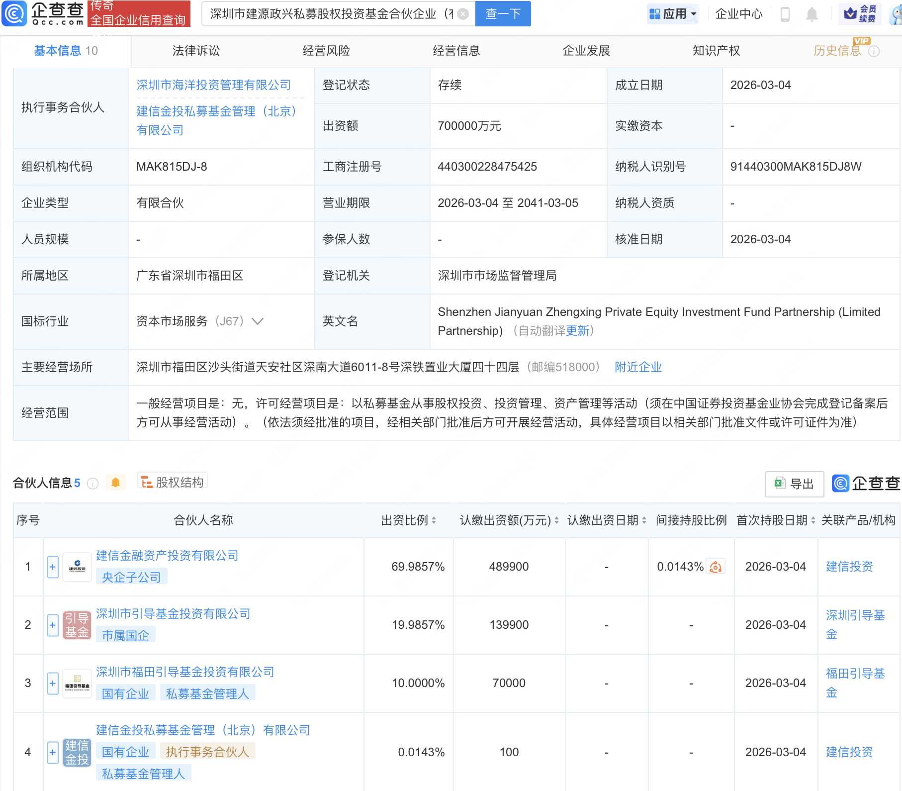 企查查APP显示,近日,深圳市建源政兴私募股权投资基金合伙企业(有限合伙)成立,出资额70亿元,经营范围包含:以私募基金从事股权投资、投资管理、资产管理等活动。企查查股权穿透显示,该企业由建信金融资产投资有限公司、深圳市引导基金投资有限公司等共同出资。