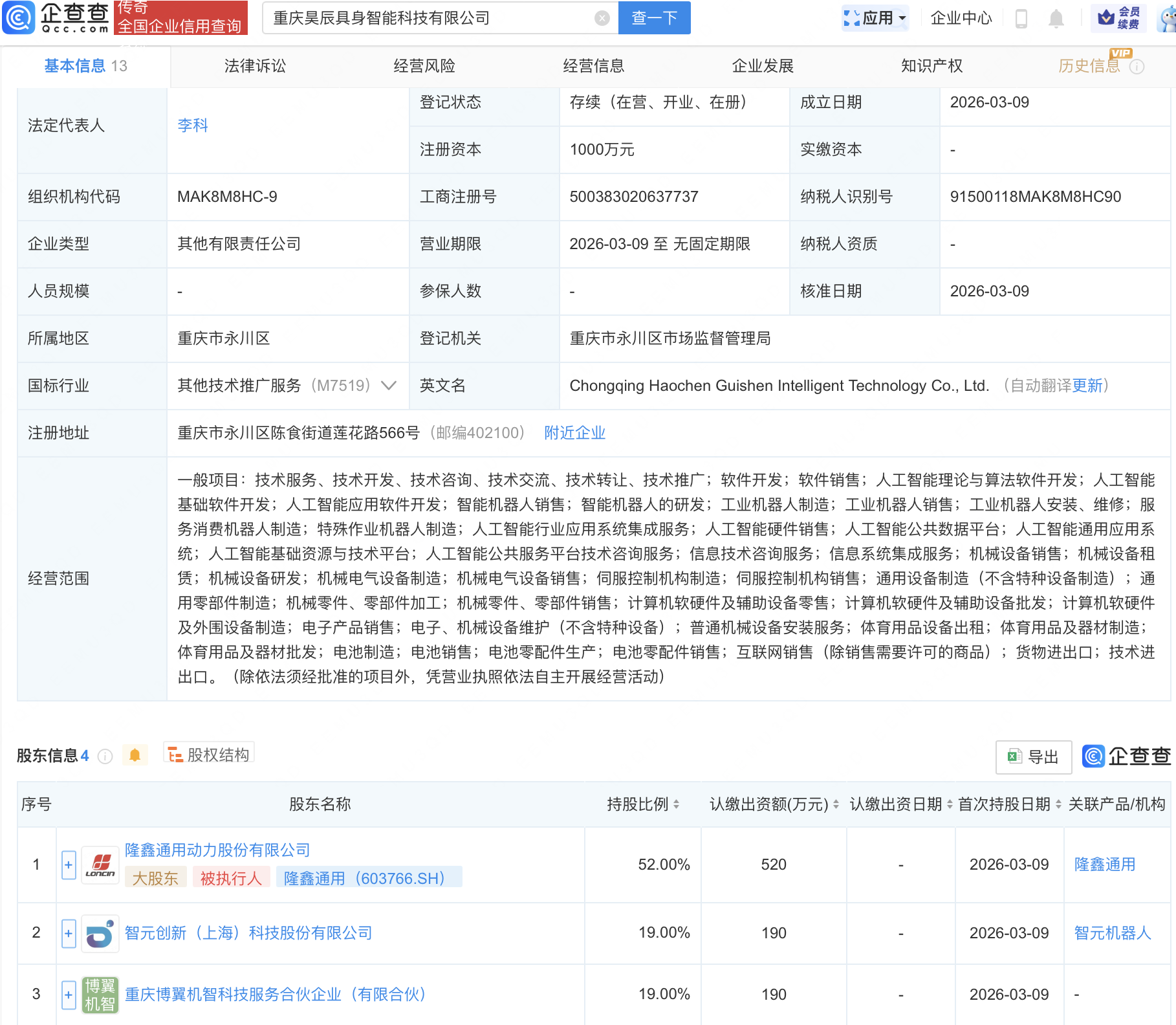 企查查 APP 显示,近日,智元机器人关联公司智元创新(上海)科技股份有限公司分别携手隆鑫通用(603766)、卧龙电驱(600580)新设重庆昊辰具身智能科技有限公司,浙江智龙未来机器人有限公司,经营范围均包含智能机器人的研发;人工智能硬件销售等。
