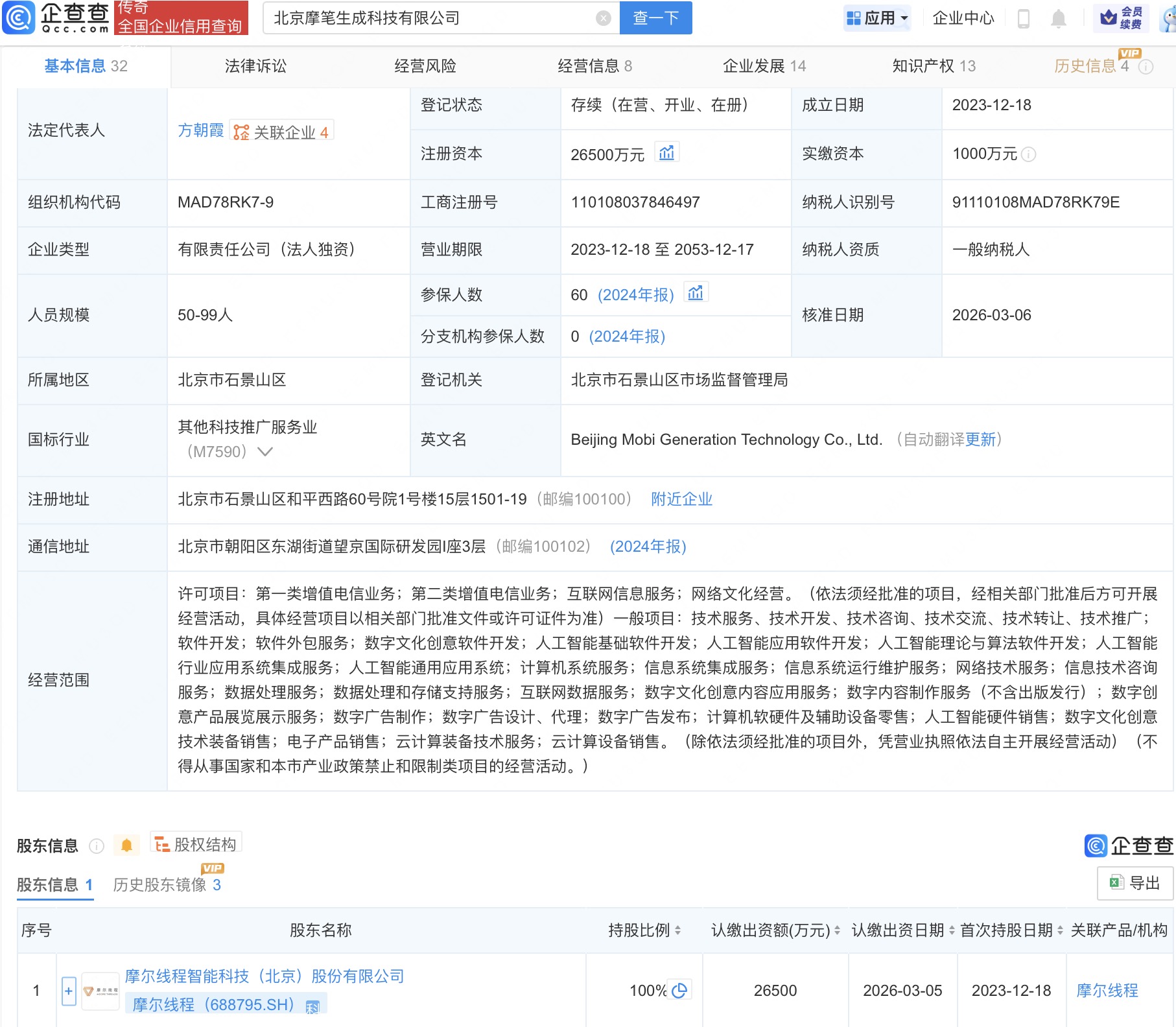 企查查APP显示,近日,北京摩笔生成科技有限公司发生工商变更,注册资本由6500万元增至2.65亿元。 企查查信息显示,该公司成立于2023年,法定代表人为方朝霞,经营范围包括人工智能基础软件开发、人工智能应用软件开发、软件开发、数据处理服务等,由摩尔线程(688795)全资持股。