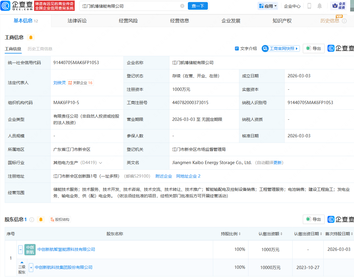企查查APP显示,近日,鹤山凯博储能技术有限公司、江门凯博储能有限公司成立,法定代表人均为刘俊灵,注册资本均为1000万元,经营范围均包含:储能技术服务;智能输配电及控制设备销售;工程管理服务;电池销售等。企查查股权穿透显示,两公司均由中创新航(03931.HK)间接全资持股。