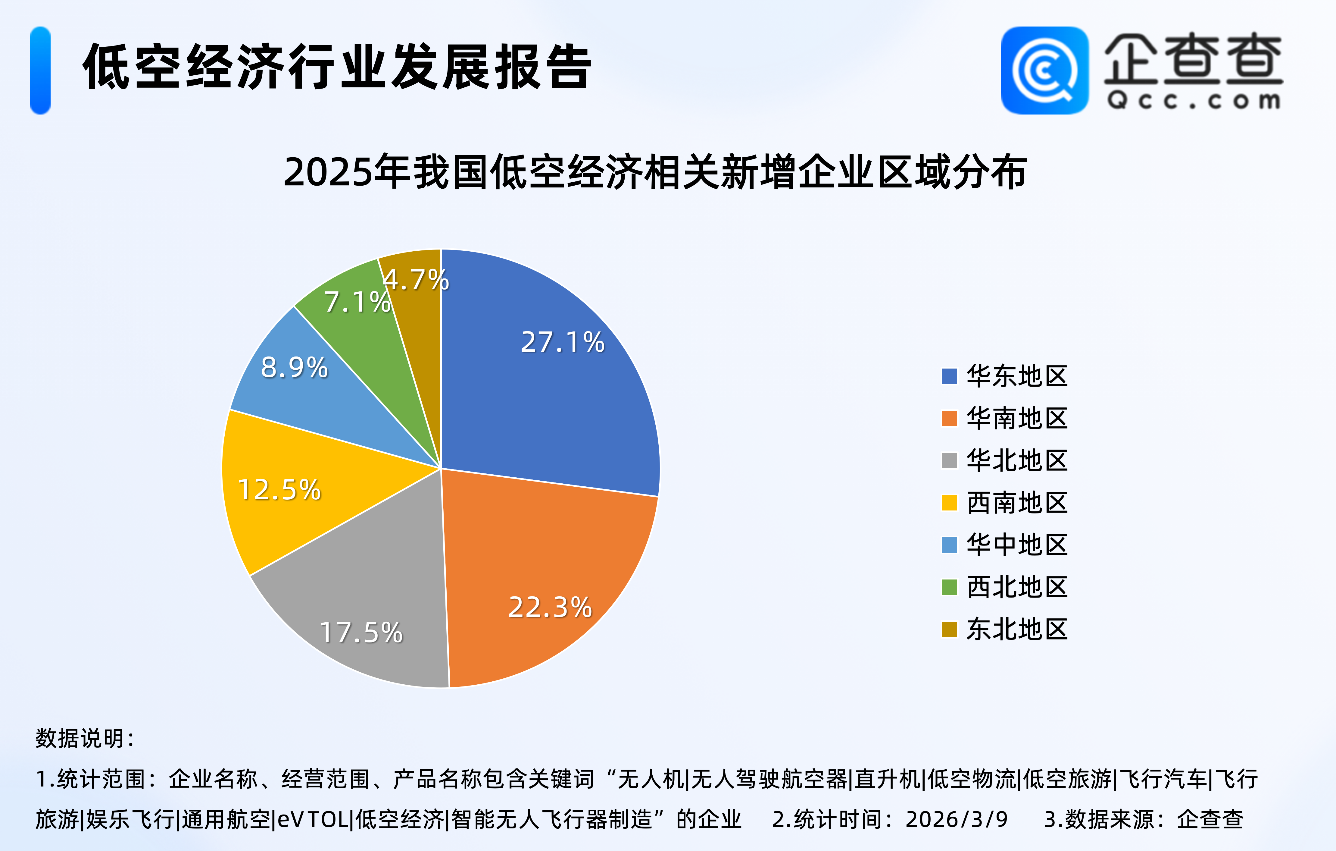 企查查数据显示,2025年新注册的近5万家低空经济相关企业中,位于华东地区的相关企业最多,占比27.1%,其次是华南地区,占比22.3%,西北、东北地区相对较少,分占7.1%、4.7%。