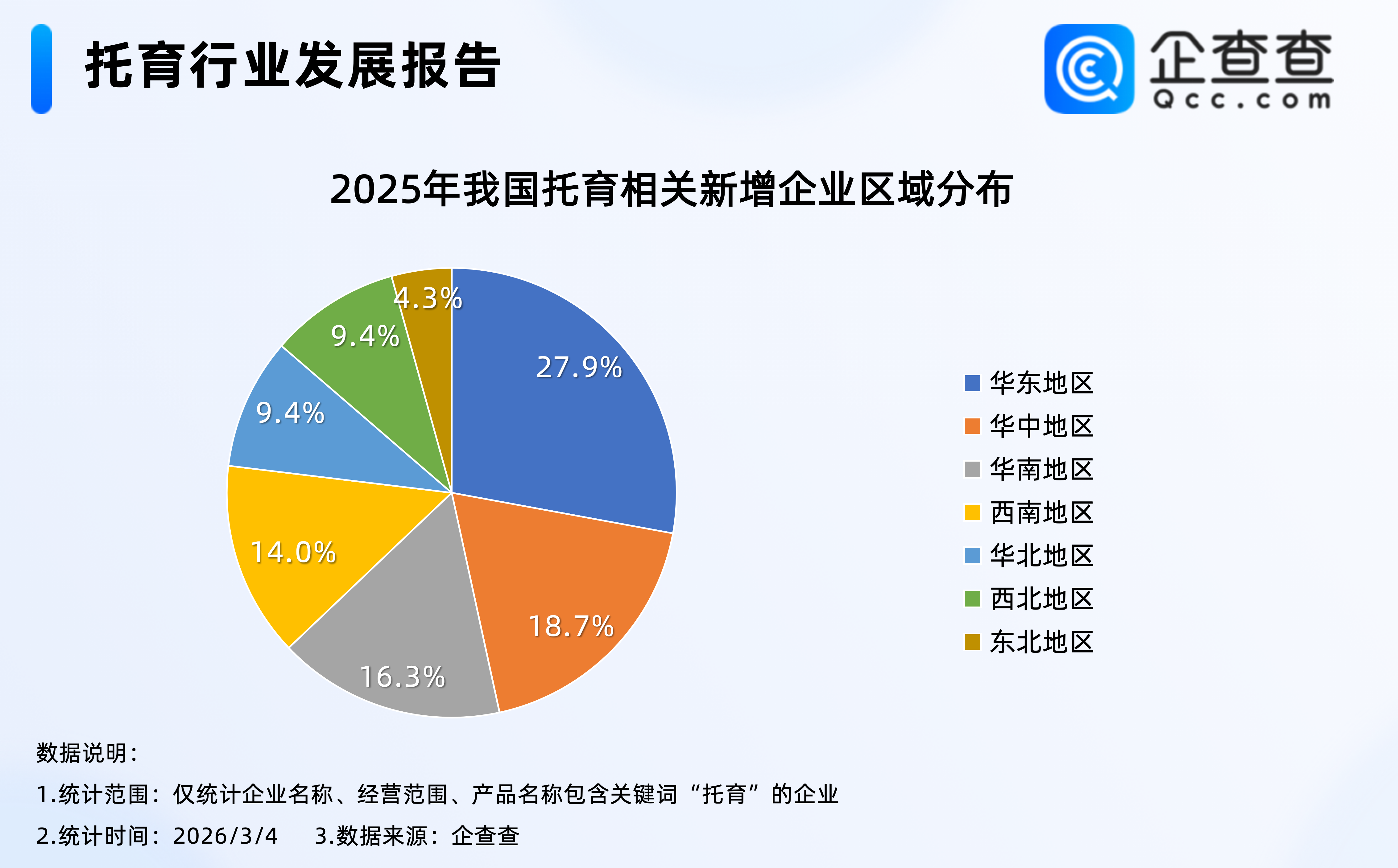 企查查数据显示,截至2026年3月4日,我国现存14.3万家托育相关企业,区域分布上,华东地区最多,占比33.5%,其次是华南、华中地区,分别占比14.6%、14.5%;注册量方面,2025年全年我国累计注册1.98万家托育相关企业,与全国存量区域分布不同的是,华中地区2025年相关企业注册量超过华南地区,占全国当年注册总量的18.7%,华南地区占比16.3%。截至3月4日,2026年我国已注册2008家托育相关企业。