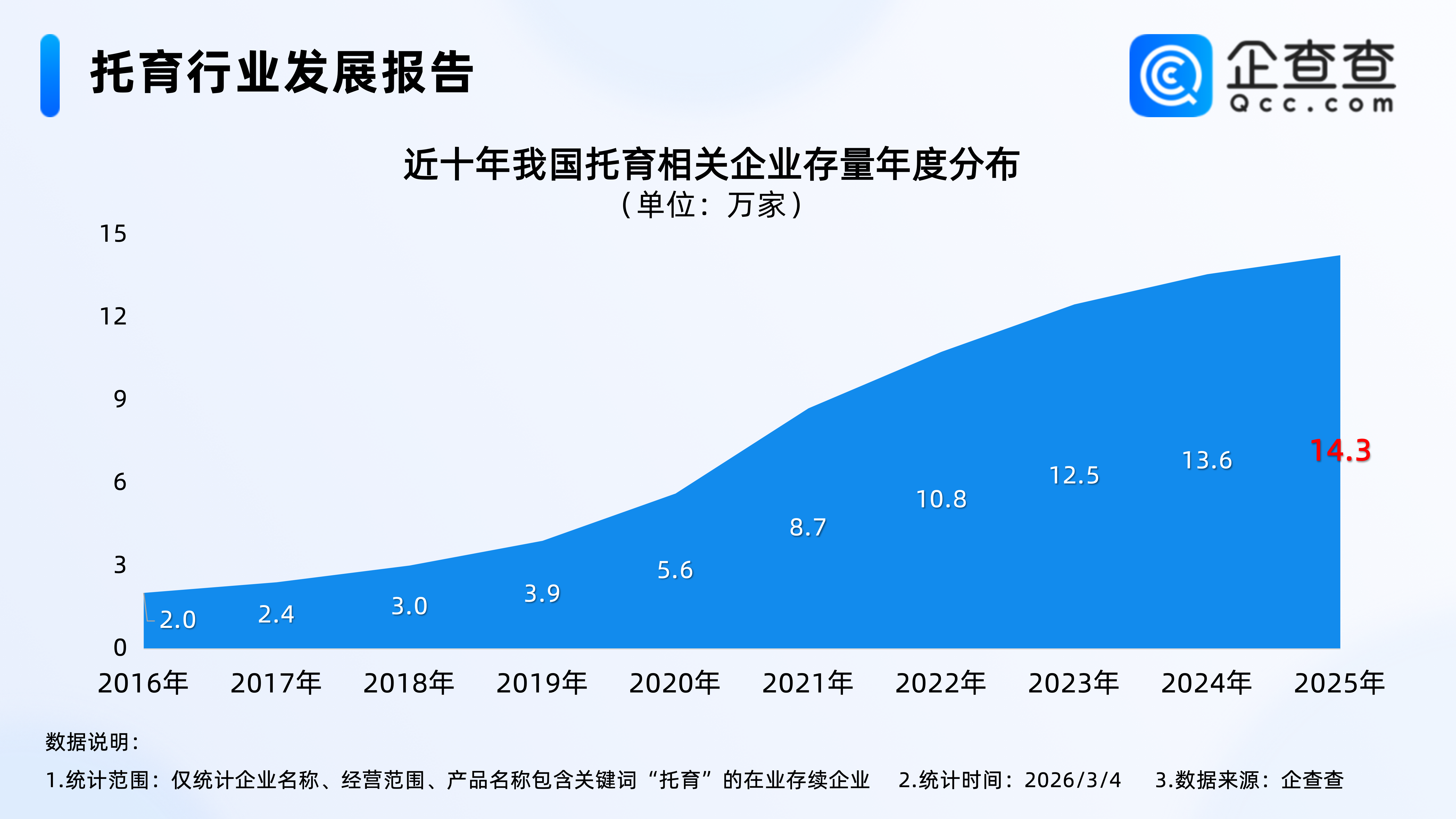 企查查数据显示,近十年,我国托育相关企业存量逐年增加,2020年开始增速加快,并于2022年年底突破10万家,达10.8万家;截至2026年3月4日,我国现存14.3万家托育相关企业,与2025年年底持平。