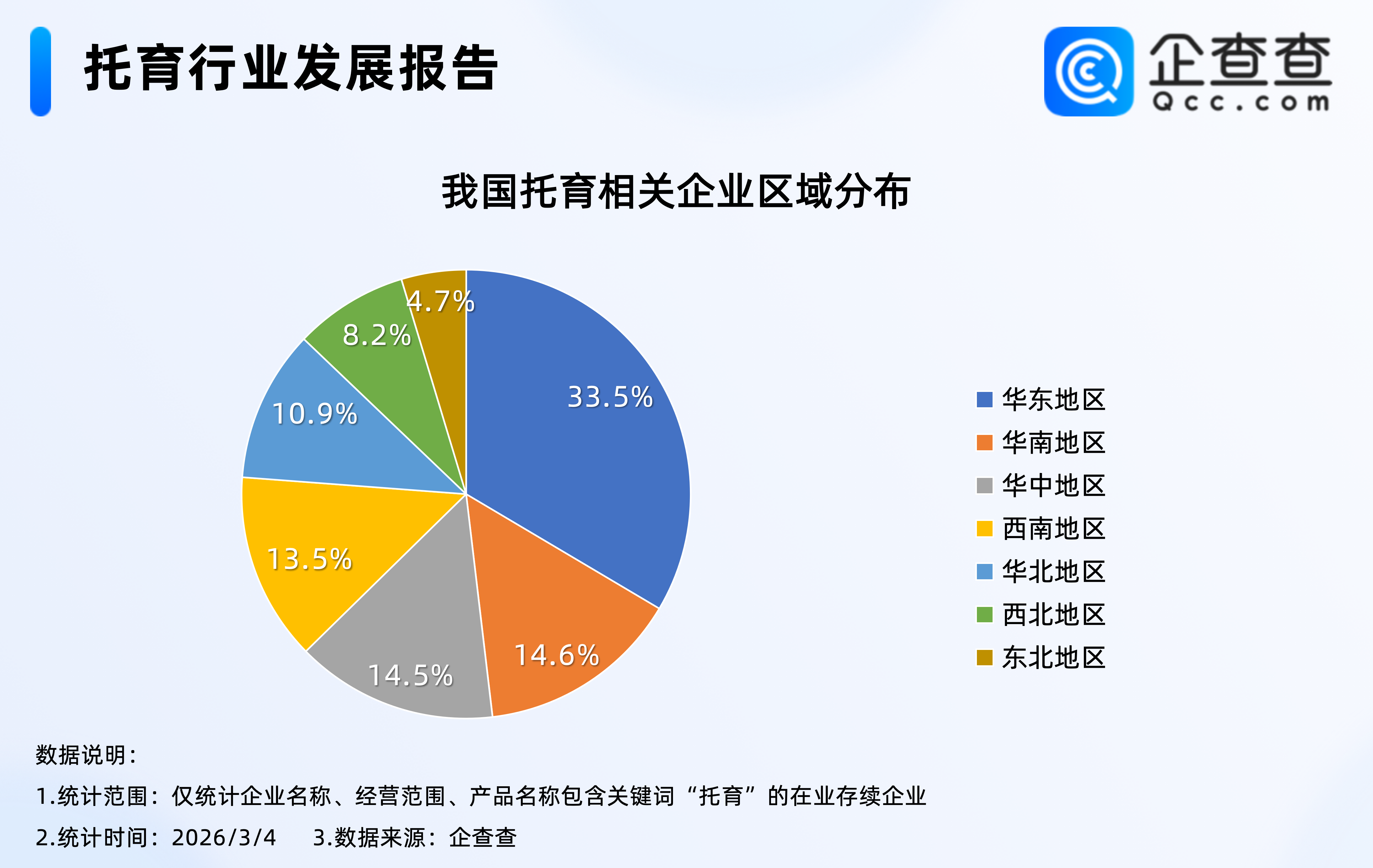 企查查数据显示,我国现存的14.3万家托育相关企业中,位于华东地区的相关企业最多,占比33.5%,其次是华南、华中地区,分别占比14.6%、14.5%;东北地区相对最少,占比4.7%。