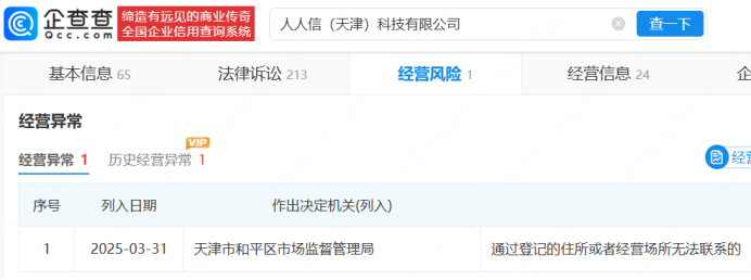 据报道人人信经理暗示,其商业模式放款人通过电子签放高利贷挣钱,平台不断通过电子签欠条收借钱人的手续费,出了问题,谁也不用担责任。企查查显示,人人信(天津)科技有限公司已经营异常。