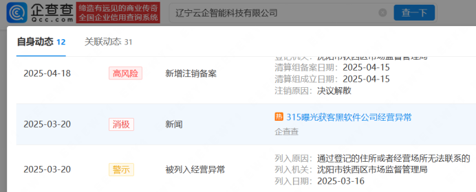 企查查显示,315曝光的辽宁云企智能科技有限公司已被列入经营异常,且在去年4月15日新增注销备案,注销原因为决议解散。
