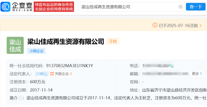 知名母婴品牌残次料竟被翻新售卖,涉多家品牌。企查查APP显示,被点名的梁山希希纸制品有限公司仍在业,该公司成立于2022年,法定代表人为刘某乾,其担任监事的梁山佳成再生资源公司已于2025年7月16日注销。