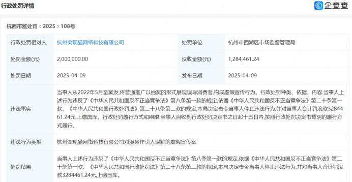 315晚会点名多家企业,其中杭州变现猫网络科技有限公司被罚没超328万,企查查显示,去年7月以来,法定代表人已连续两次变更。