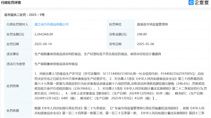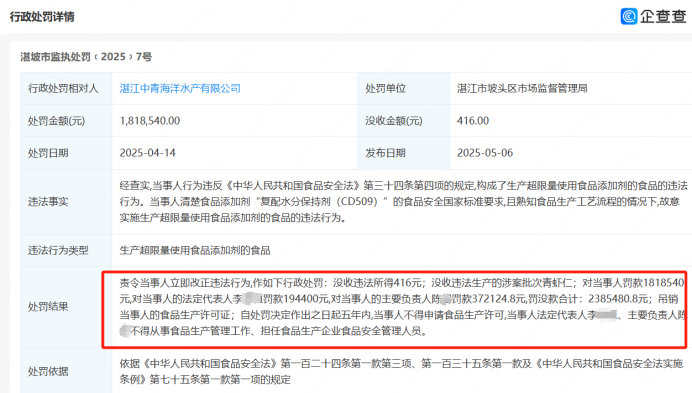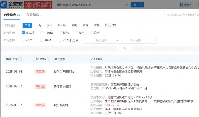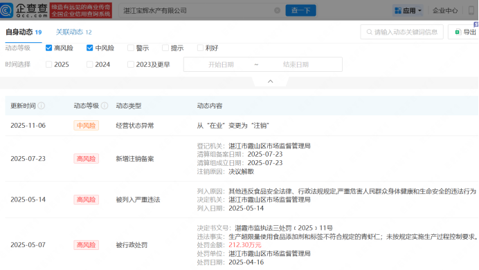 去年央视3·15晚会曝光了部分企业在加工水产品时违规、超量添加保水剂、包冰二次增重等问题,湛江宝辉水产有限公司、湛江良基冷冻食品有限公司、湛江尚方舟食品有限公司、湛江中青海洋水产有限公司被点名,3月16日,湛江市场监督管理局发布食品召回通告,要求涉事4家企业召回过去18个月的虾仁。企查查APP显示,湛江宝辉水产有限公司被罚约212万,已于去年11月注销;湛江良基冷冻食品有限公司被罚约128万,已发布简易注销公告;湛江尚方舟食品有限公司被罚约226万,公司多次欠税被公告;湛江中青海洋水产有限公司及相关人员分别被罚款,罚没款合计超238万元。