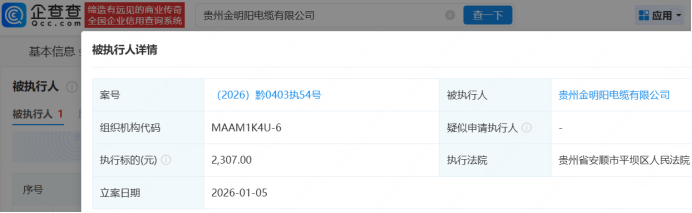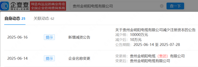 企查查显示,涉事企业之一贵州金明阳电缆(集团)有限公司已更名为贵州金明阳电缆有限公司,当前已成被执行人,注册资本由1亿减至10万元。