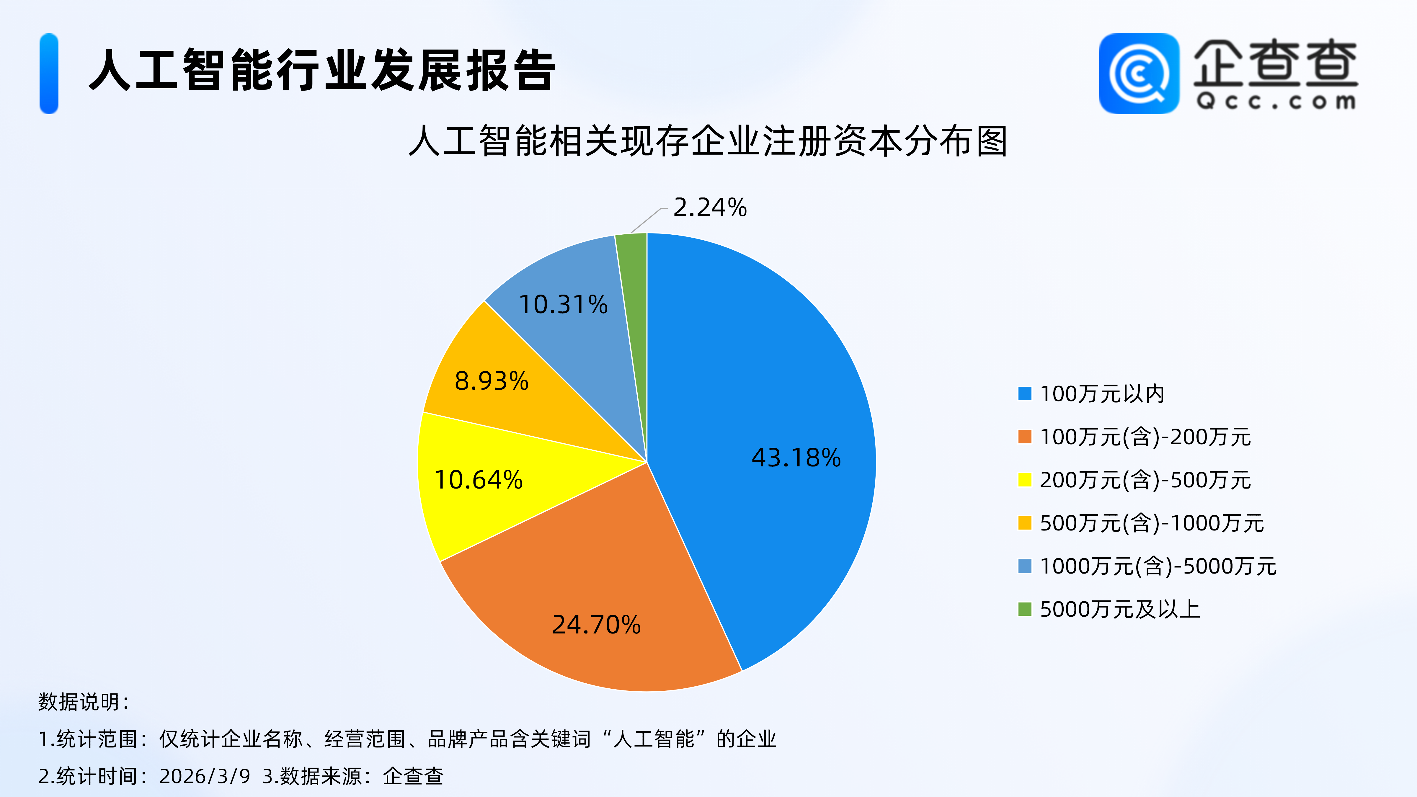 企查查数据显示,从注册资本分布来看,我国人工智能相关企业呈现出以中小规模为主的格局,资本体量分层特征显著。超四成的现存人工智能相关企业注册资本在100万元以内,占比达43.18%,成为行业内最主要的企业群体,反映出人工智能领域创业门槛相对友好,吸引了大量中小微市场主体入局。而资本实力较强的头部梯队企业占比相对有限,其中注册资本1000万元(含)-5000万元的企业占10.31%,5000万元及以上的仅占2.24%,千万元及以上注册资本企业合计占比13%。