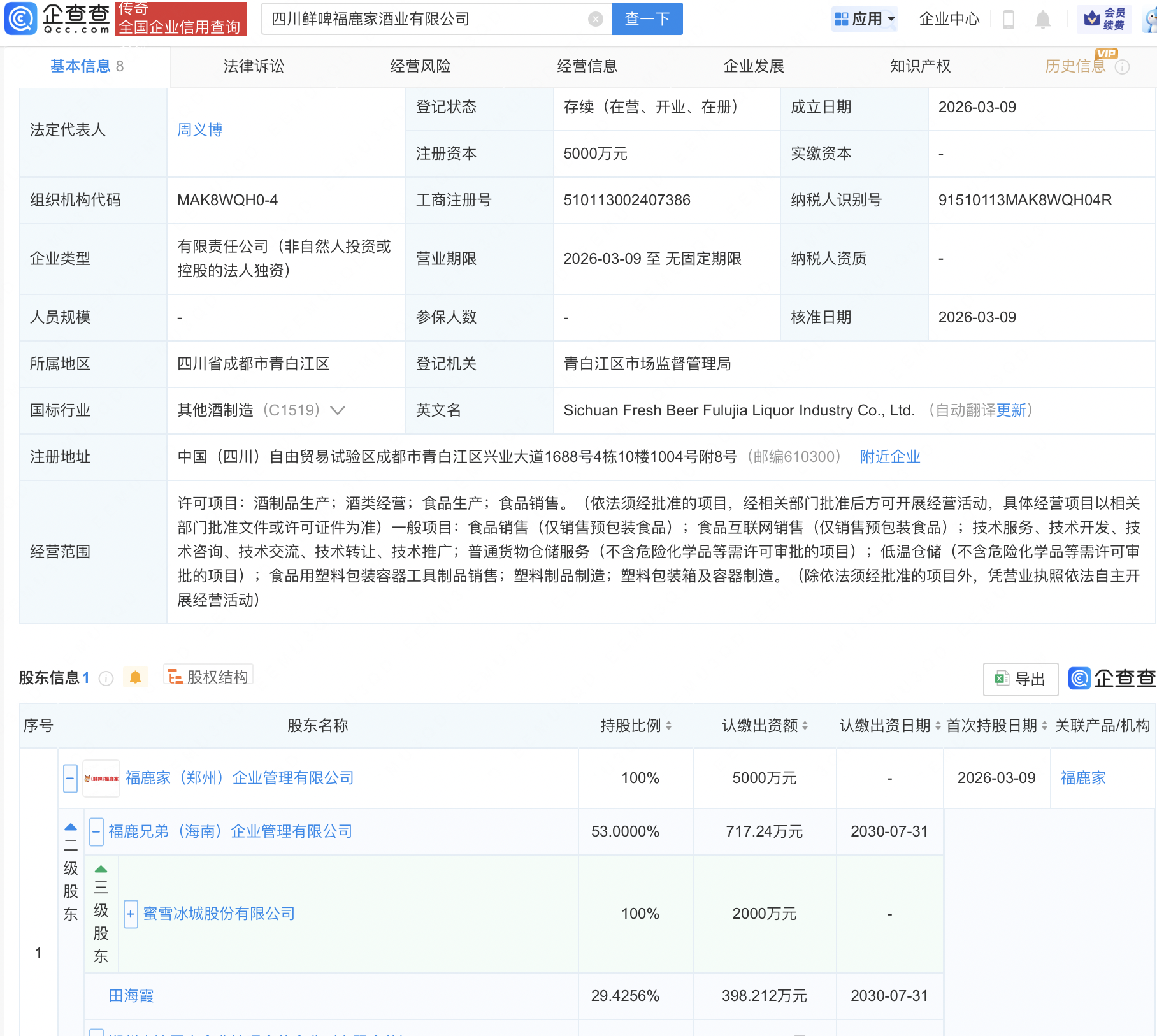 企查查APP显示,近日,四川鲜啤福鹿家酒业有限公司成立,法定代表人为周义博,注册资本5000万人民币,经营范围包括酒制品生产、酒类经营、食品生产、食品销售等。企查查股权穿透显示,该公司由蜜雪集团(02097.HK)旗下福鹿家(郑州)企业管理有限公司全资持股。